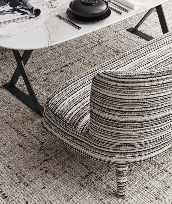 Febo is a family of seats that carries with it the memory of a traditional design distinguished by a large enveloping back without armrests. The sofas, available as two-seater or three-seater, come in two sizes: a smaller one with low or high seat cushion and a larger one. The upholstery is in fabric or leather with visible blanket stitching. The base-frame and legs are in solid wood and are also available in a single-material version, covered in fabric or leather like the cushions.