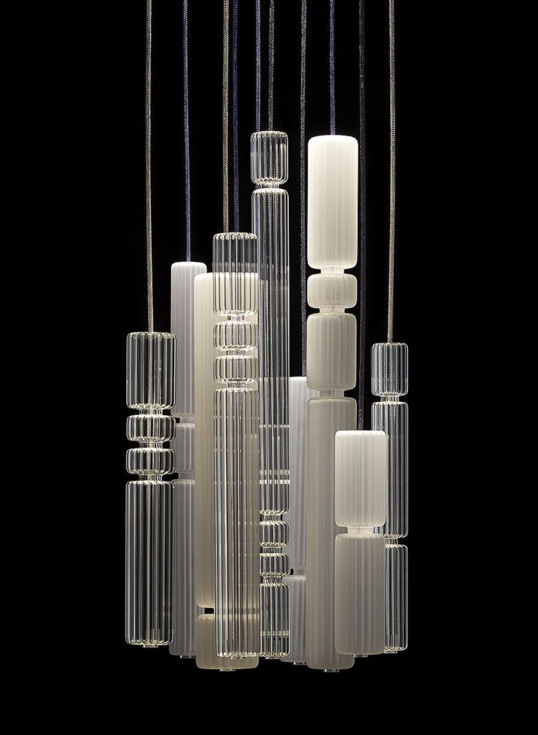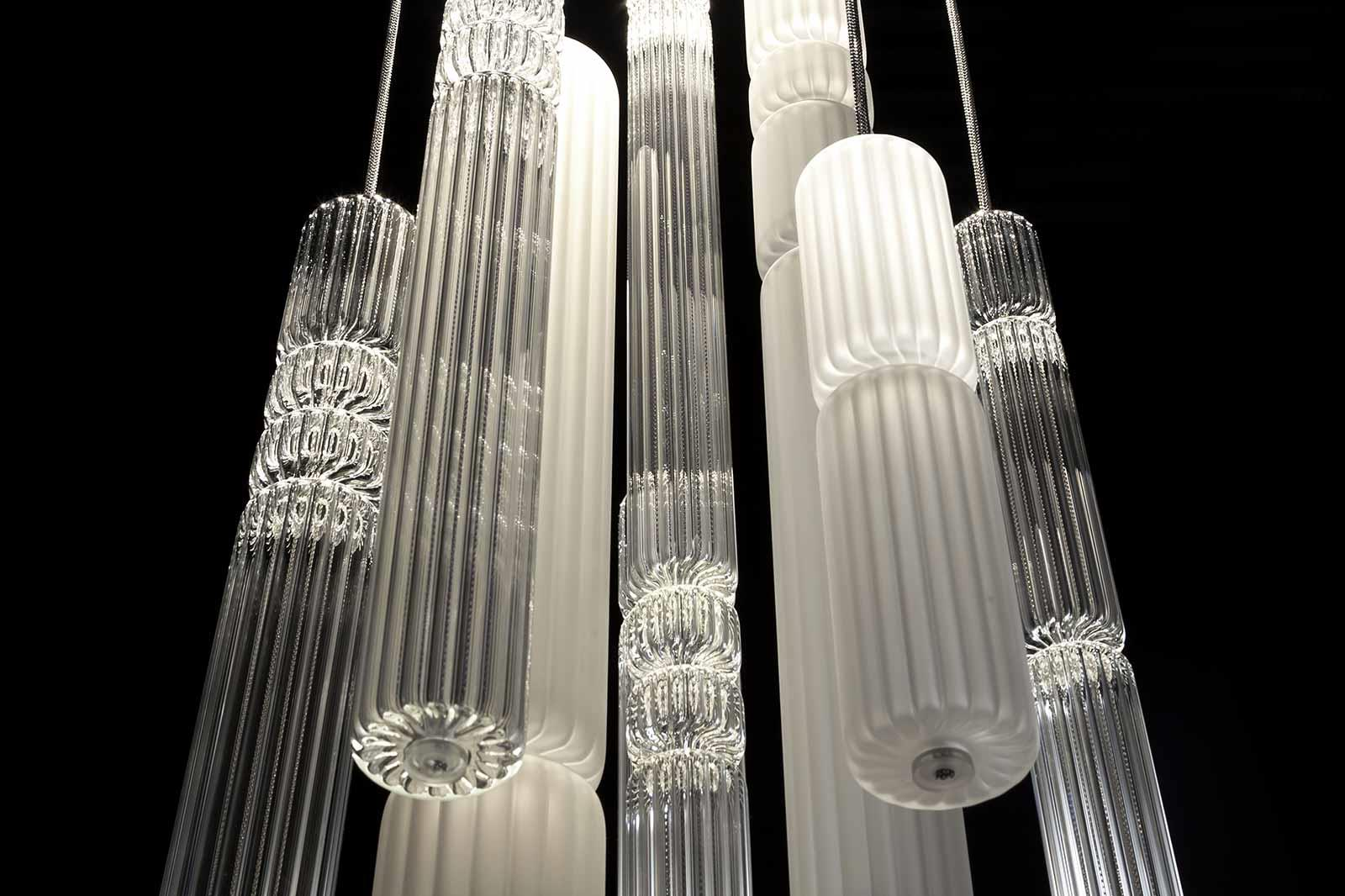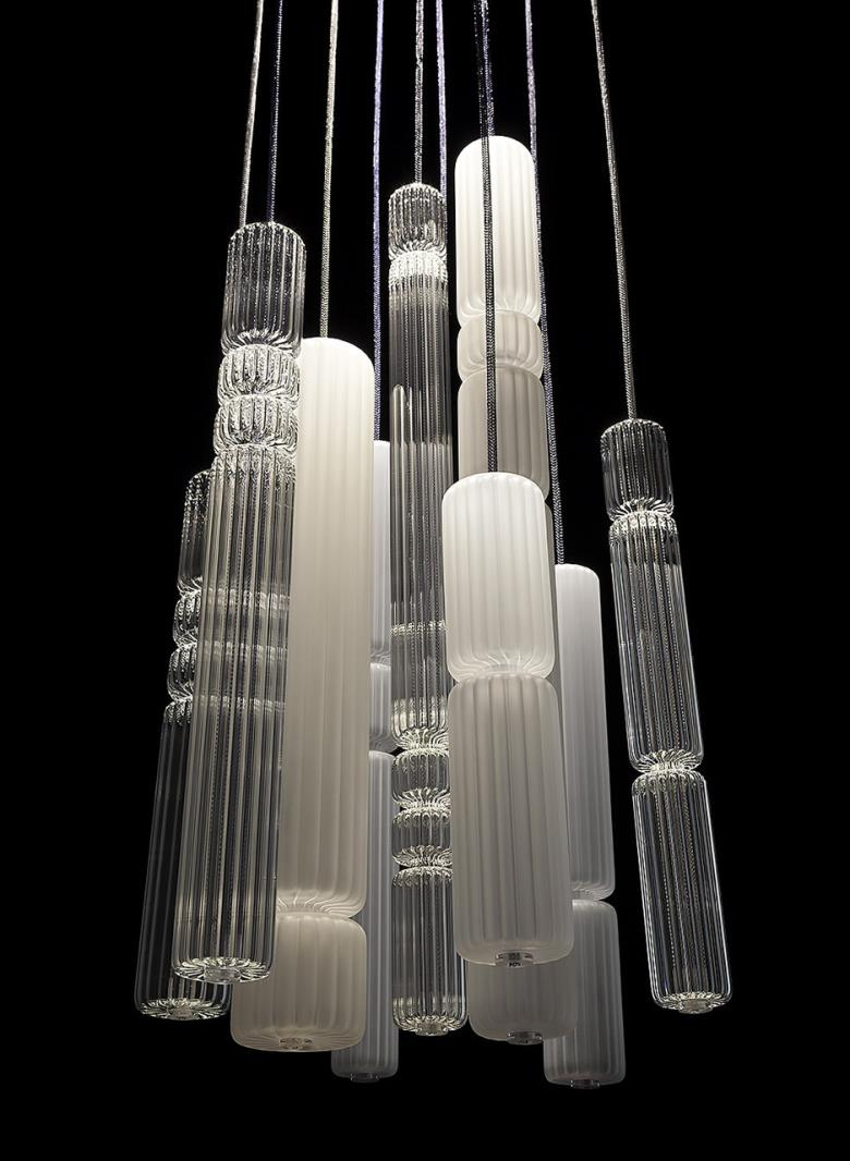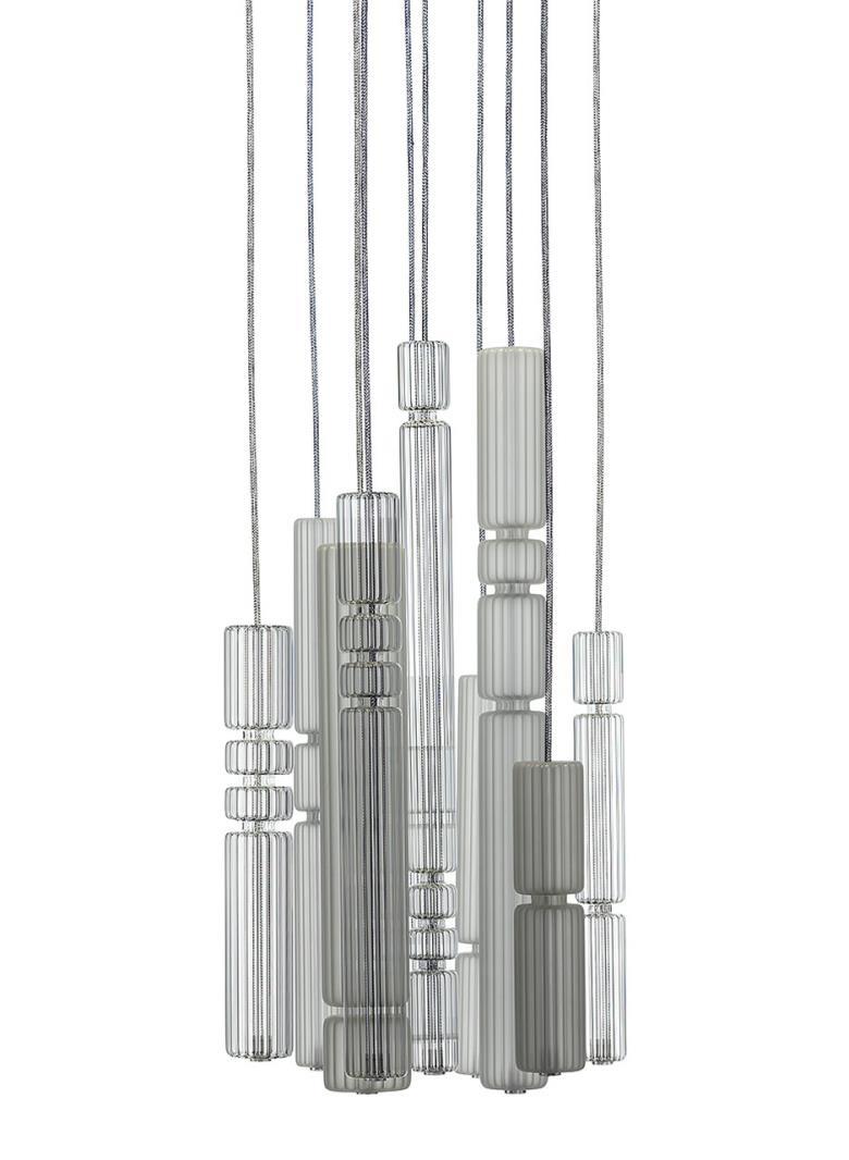 Suspension lamp. Hand blown titanium metallized glass dome with internal frosted bubble glass sculpture.