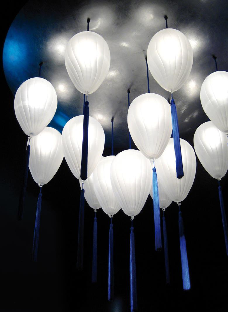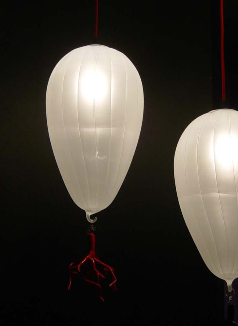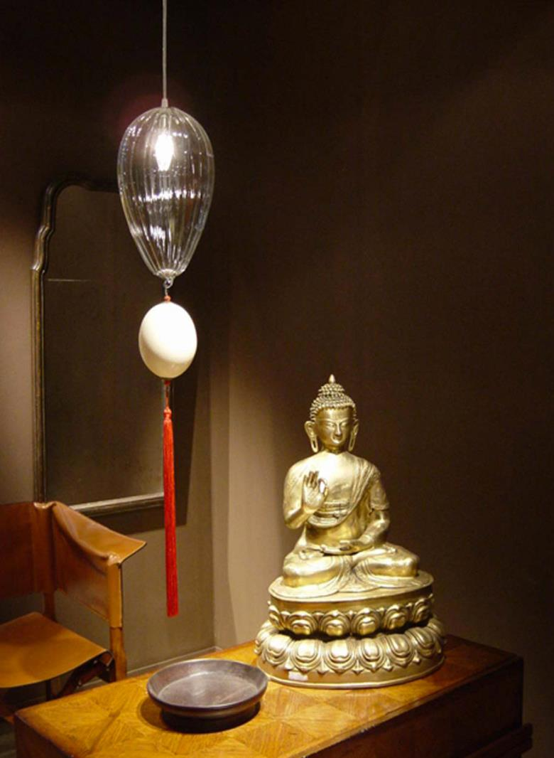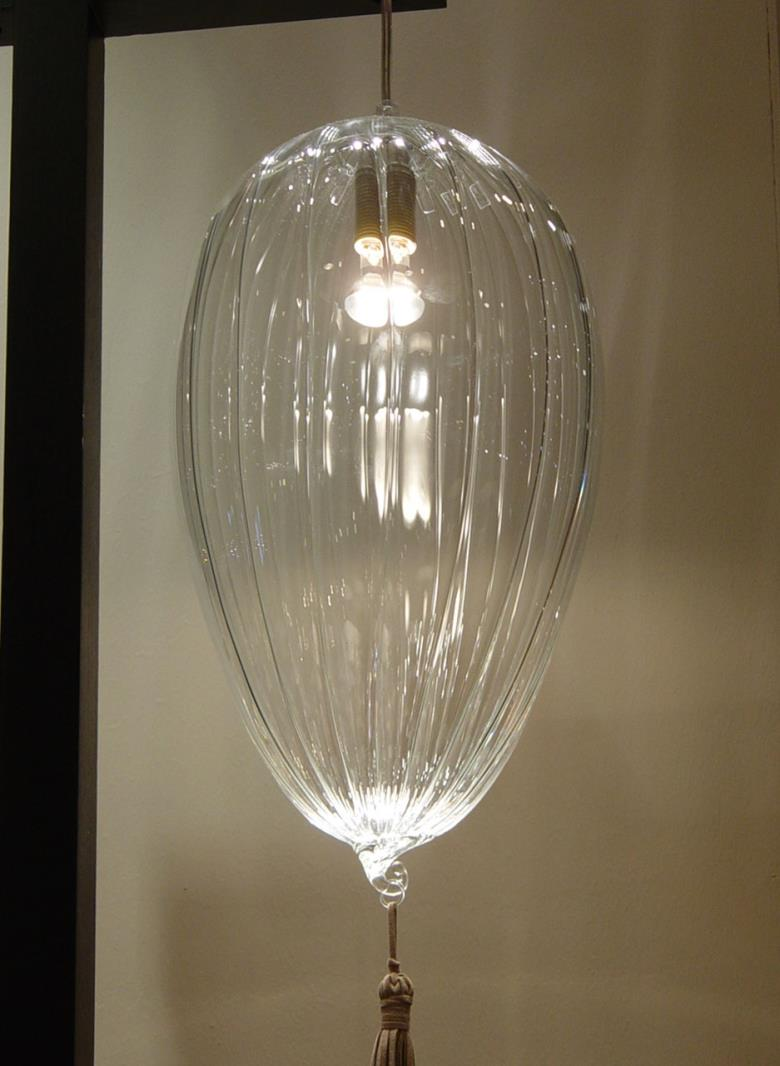 Suspension lamp. Hand blown titanium metallized glass dome with internal frosted bubble glass sculpture.