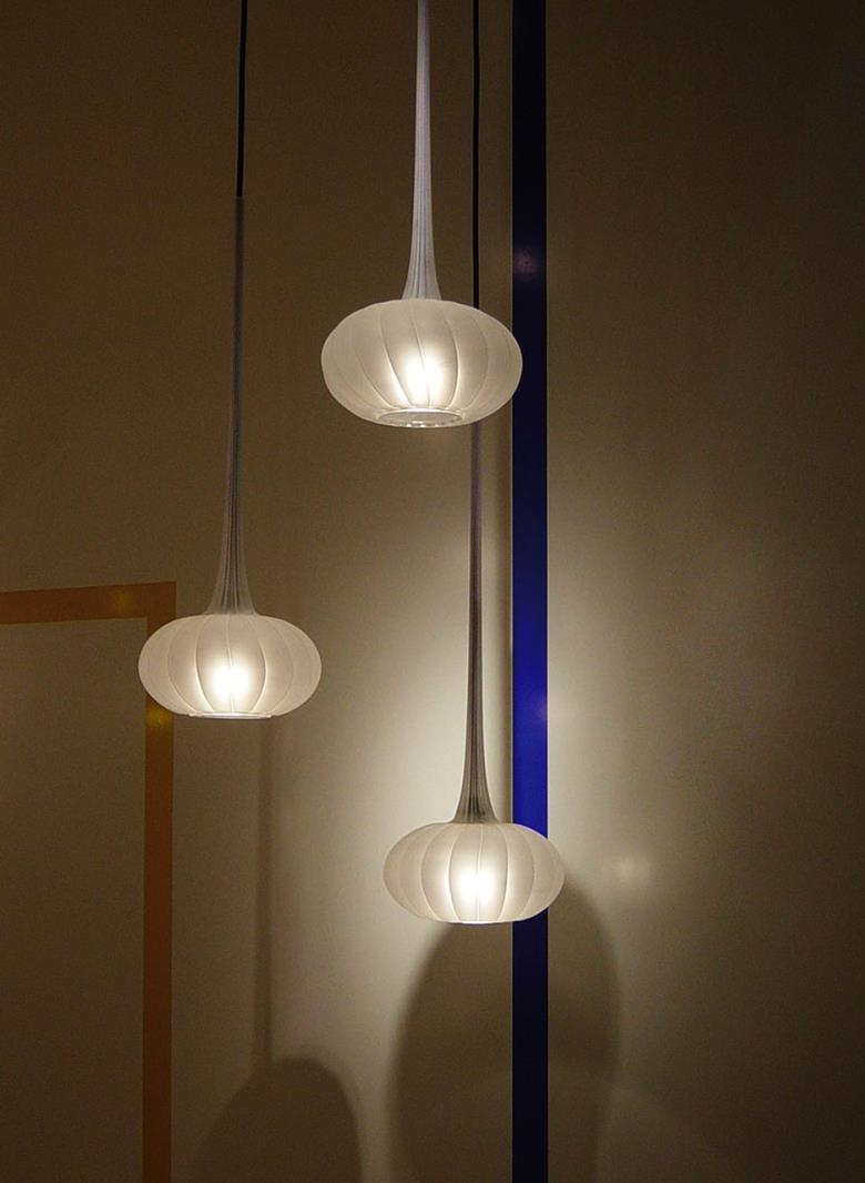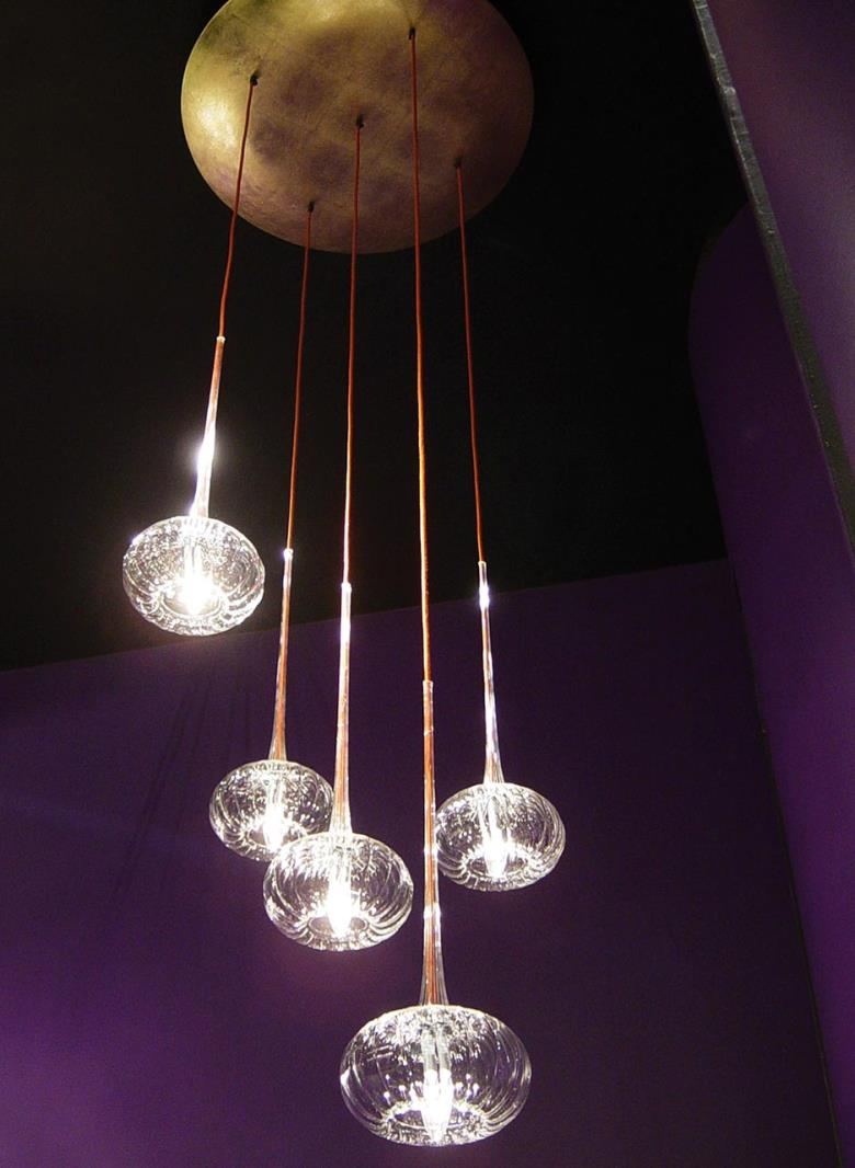 Suspension lamp. Hand blown titanium metallized glass dome with internal frosted bubble glass sculpture.