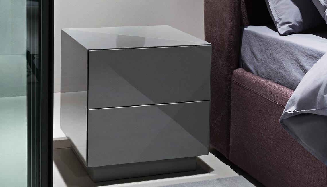 兩屜式木質45度斜切處理的床頭柜。有一下飾面可供選擇-啞光漆-亮光漆-左側為亮面漆,右側和后部和抽屜為啞光漆。 頂部由45度“切割”設計分成右側/前部和光面漆,右側/后部則是啞光漆。