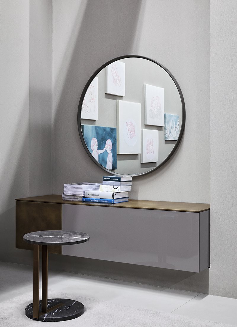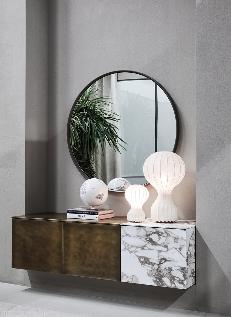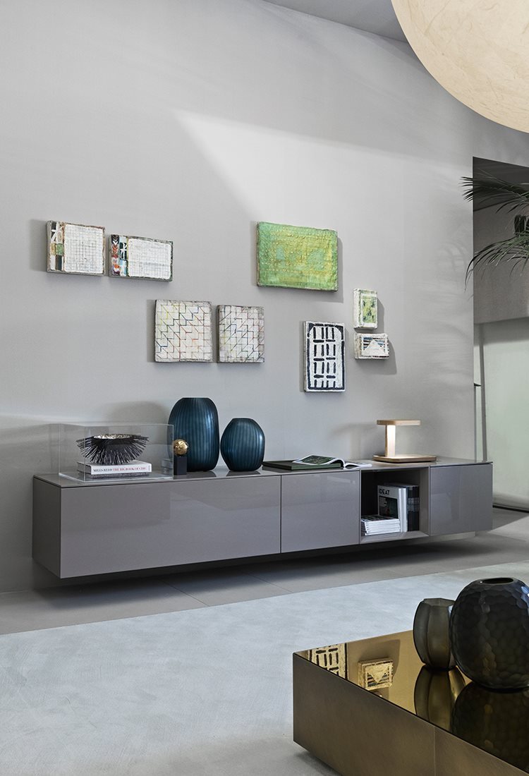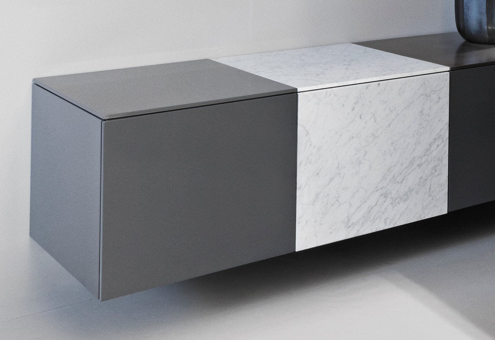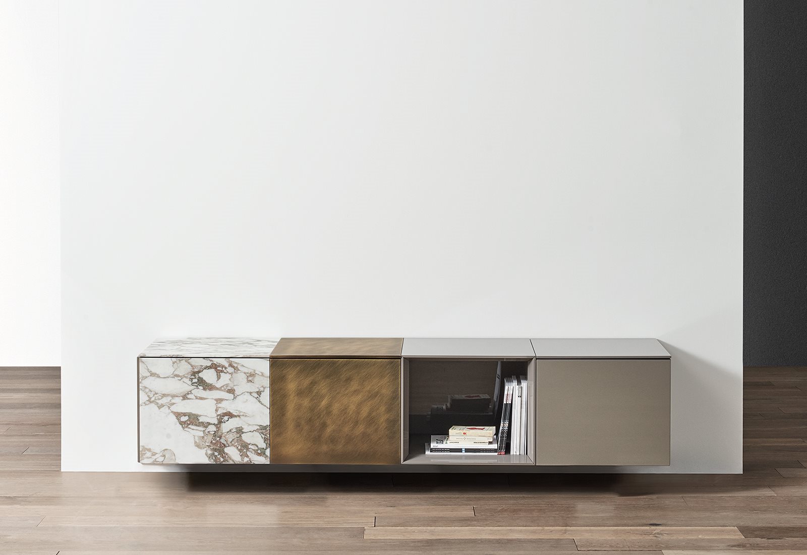 一系列以純線條為特征的壁掛式模塊化單元,結合多種飾面:敞開式隔間,抽屜和落葉門等可以呈現多種形式,分割性和包含性,進而配合木材,烤漆,銅和大理石面板非常具有靈活性和多樣的組合性。