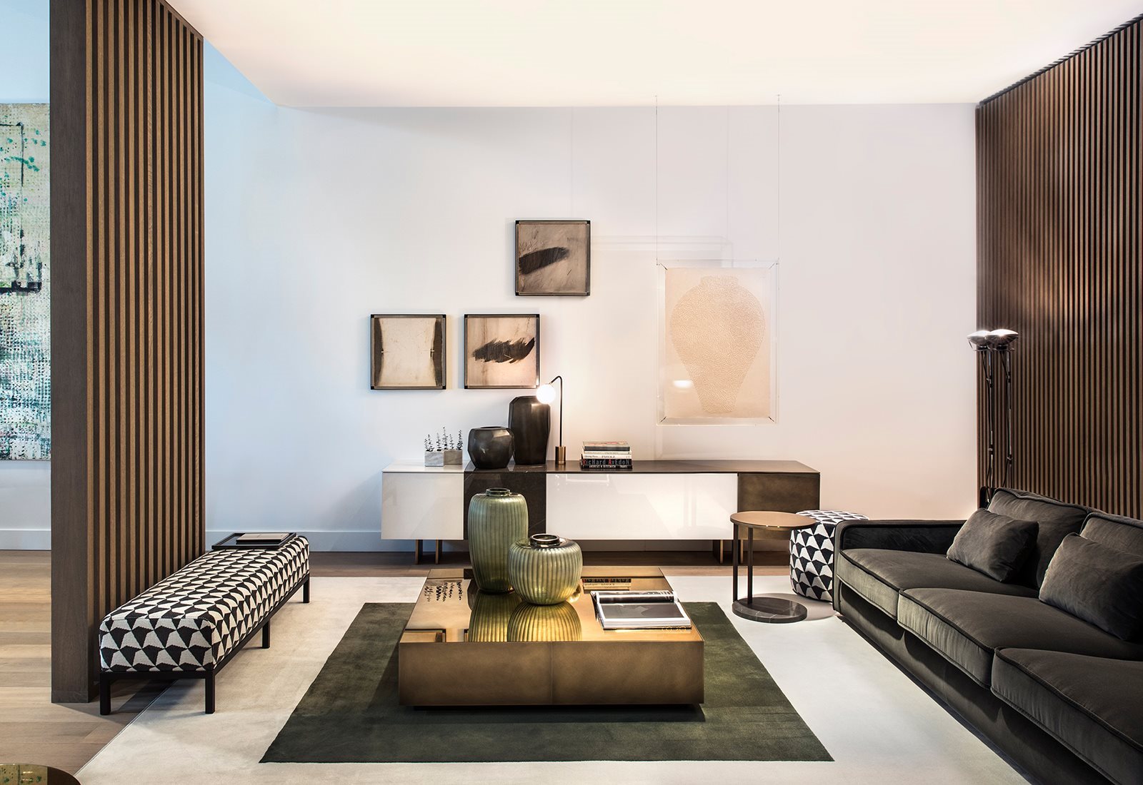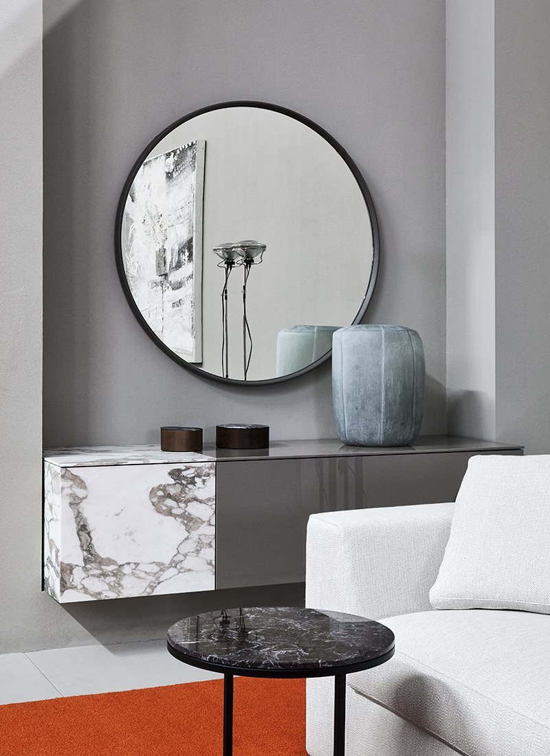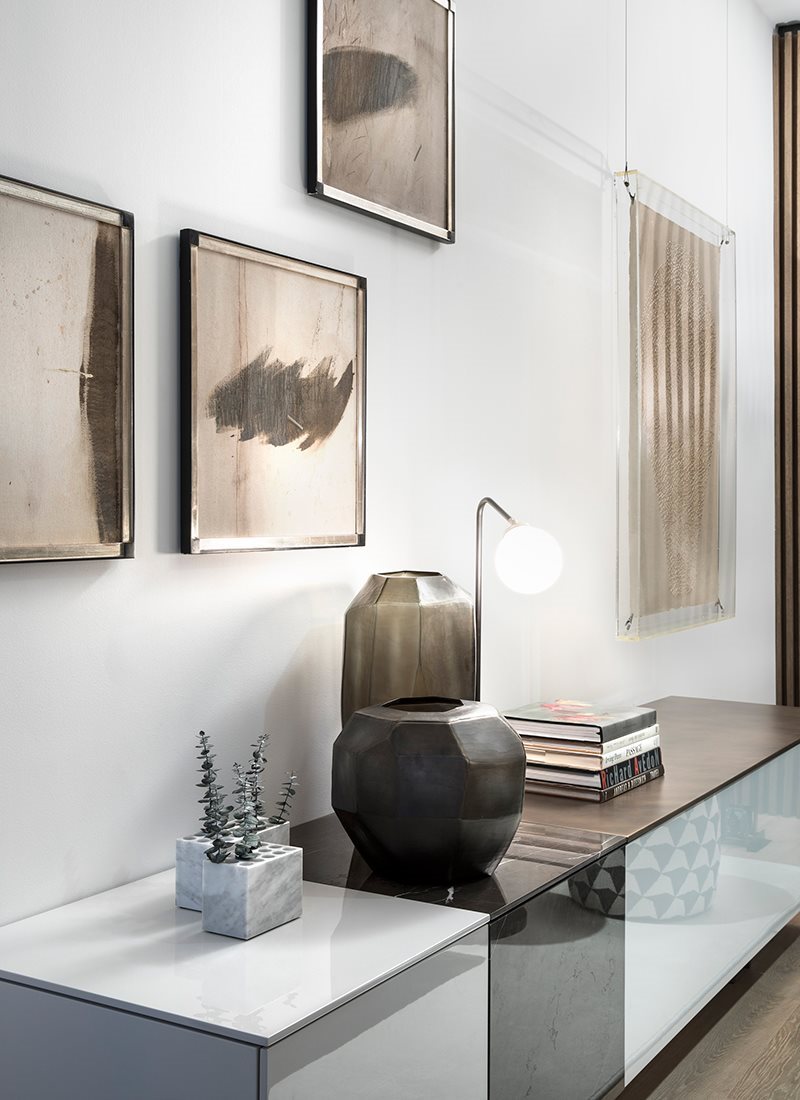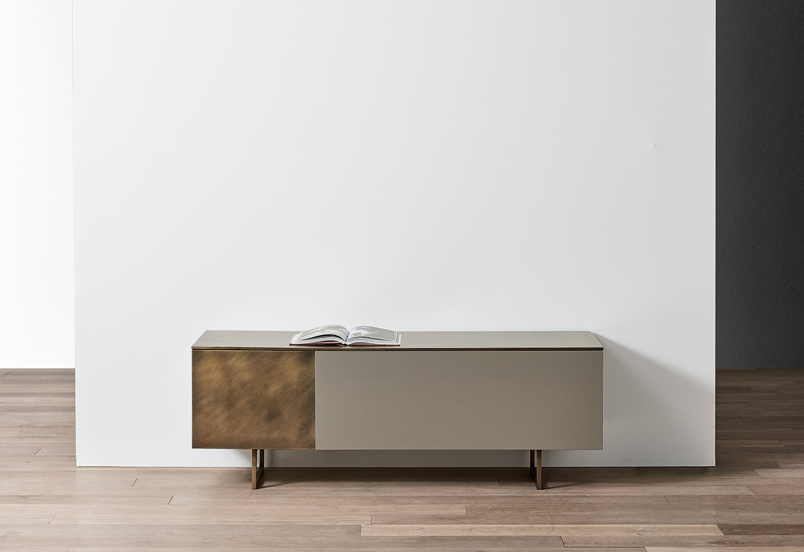 一系列以純線條為特征的壁掛式模塊化單元,結合多種飾面:敞開式隔間,抽屜和落葉門等可以呈現多種形式,分割性和包含性,進而配合木材,烤漆,銅和大理石面板非常具有靈活性和多樣的組合性。