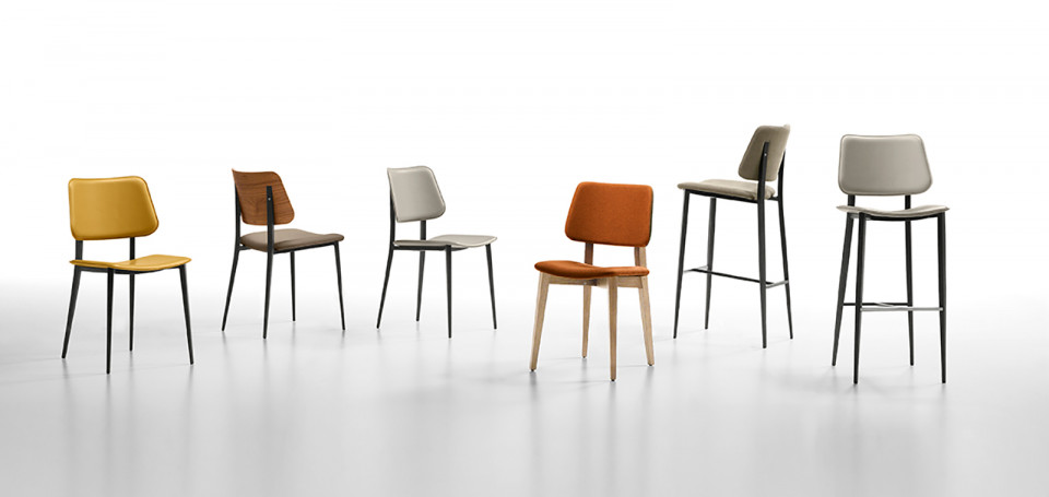 Chair with wooden four leg frame, available in different finishes. Seat and backrest upholstered with hide or regenerated hide.