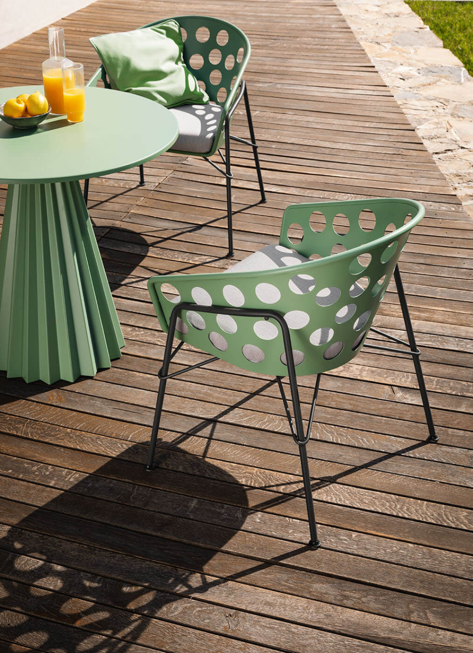 The Bolle collection was created for the outdoors and includes sofas, armchairs and lamps in macro-perforated colored metal, with a soft and playfully captivating aesthetic. The name Bolle derives from the special processing of the metal shells, which produces a texture with a strong graphic impact. Indeed, Bolle means bubbles.