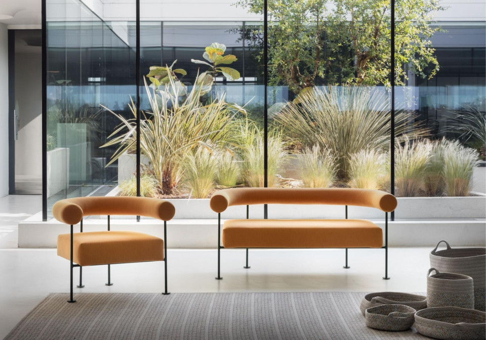 Qua-ndo lounge sofa with metal structure. Seat and backrest in fabric, faux leather or leather. Configured in cat. O1 and O2 metal with cushions upholstered in specific outdoor fabric are suitable for outdoor use, except for marine areas.