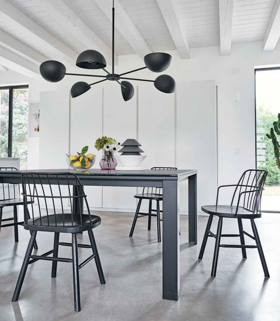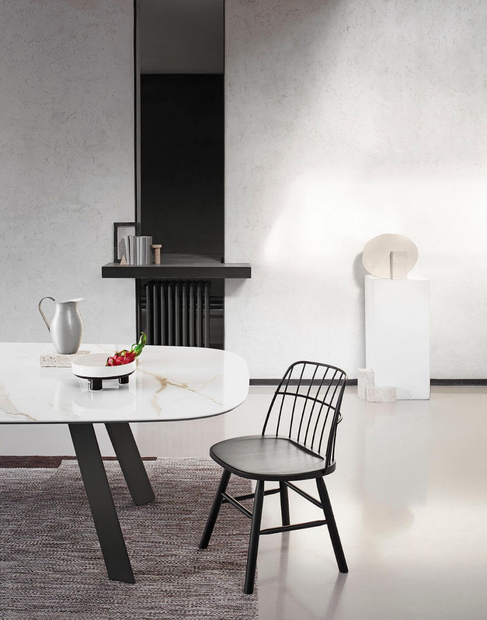 Strike chair with wooden frame and backrest in lacquered metal.
