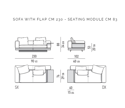 With its geometric rigour, the base creates an original contrast with the softness of the seat, conceived as a single cushion punctuated by light stitching defining the width of the seat - 83 or 68 cm - and with the structure of the backrest and armrest, covered in channelled goose down padding. The backrest and armrest form a single volume, with a 45° split in the corner.