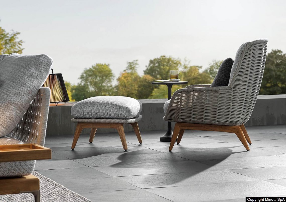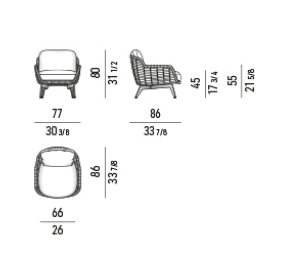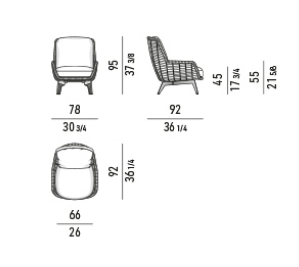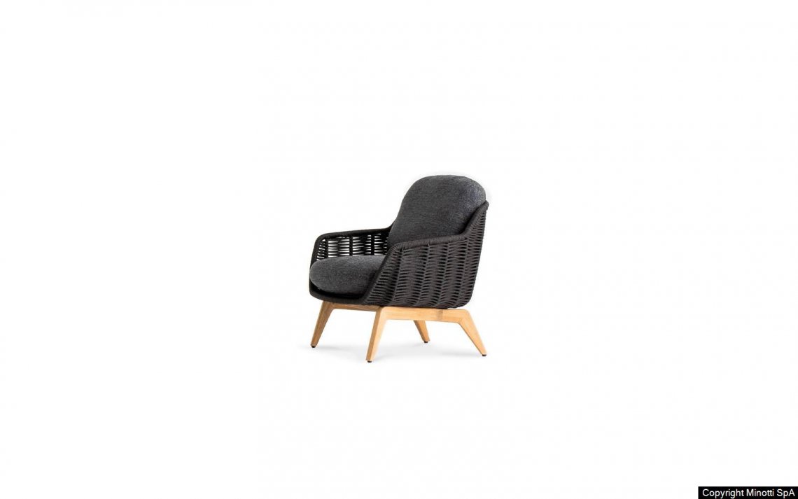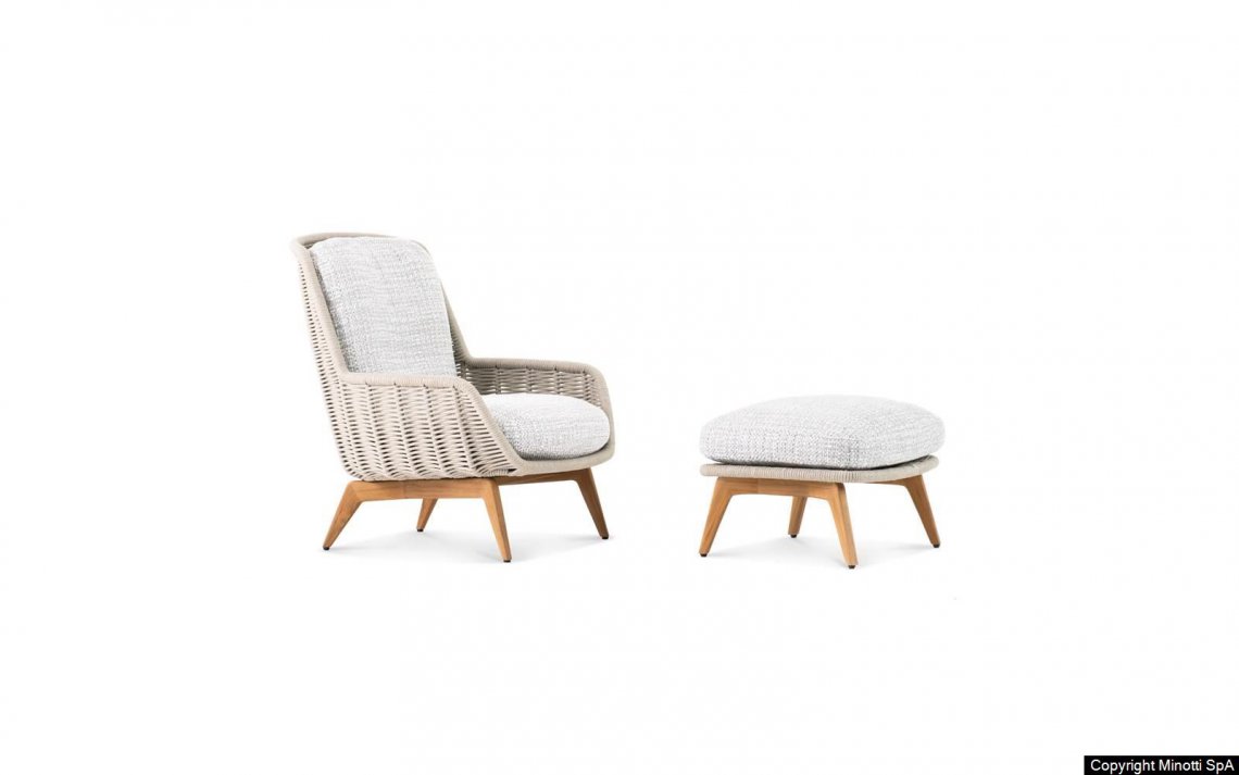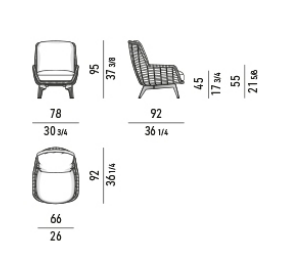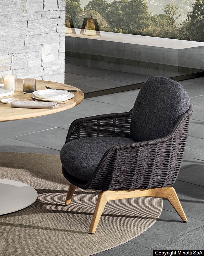 The seats rest on a matt varnished aluminium base, in the shades of Ecru and Dark Brown, reiterating the colours of the cord, and feature padded cushions with extra-durable polyurethane foam inserts, covered in water-repellent fibre and fabric.