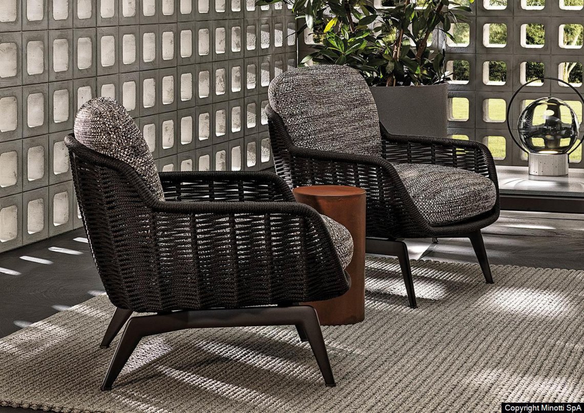 The band which, in the original design, outlines the silhouette of the volume recalling the shape of a belt, in its outdoor version becomes a corded contour in the colours Sand and Dark Brown, covering the polished Bronze steel frame.