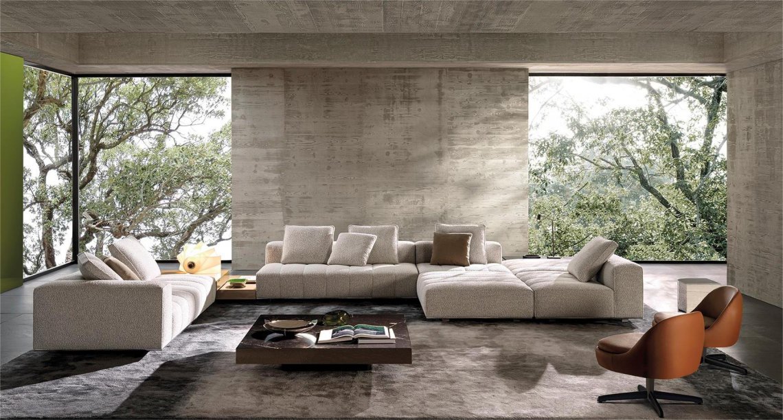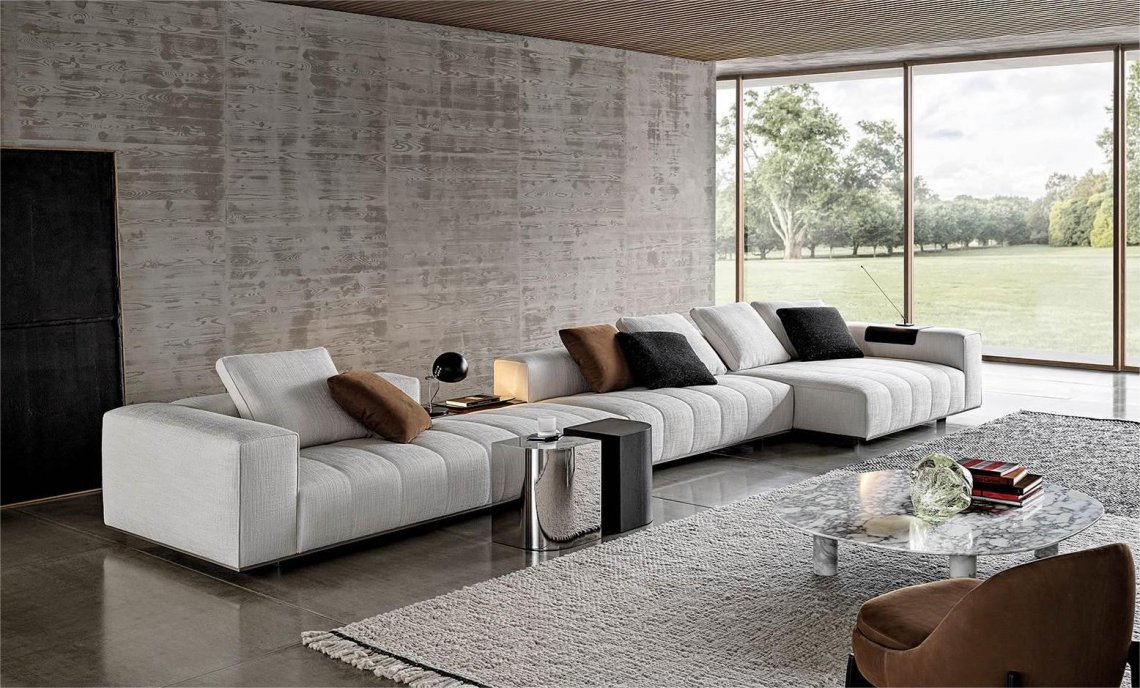 With a clear 1970s imprint, the inspiration behind this design is the graphic character of those years, its ability to stratify and cross marks, reducing the complexity of things into a few distinctive features. In this way, in Goodman the mark of the matelassé stitching, typical of Minotti's tailoring processes, draws shadows and light on the seat, creating the sensation of a quilted cross-padding.