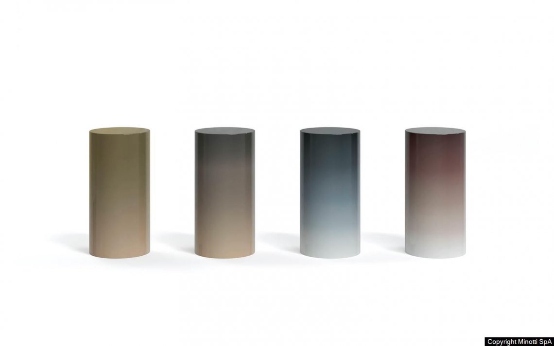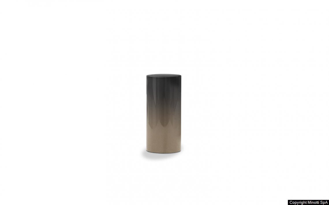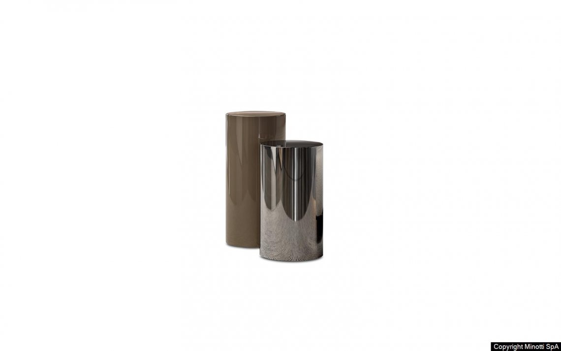 Available in two different heights, 45 or 55 cm, it is made of polished varnished metal, with a 27 cm diameter, and comes in a wide variety of existing finishes to which the new Chestnut and Malachite lacquer variants have been added. The Wood version has a curved wooden structure with a diameter of 25 cm and is finished in Liquorice-coloured open-pore lacquered ash.