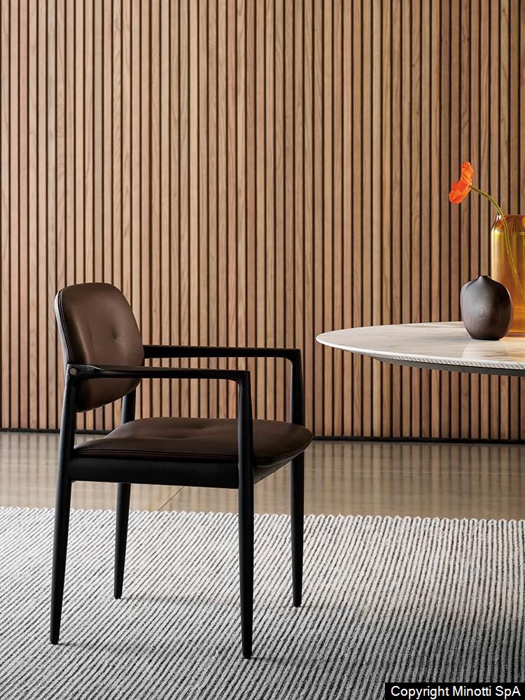 Delicate and sinuous lines, created with precious cabinet-making interlocking techniques that enrich the structure of legs and armrests in solid ash open pore wood lacquered with a Liquorice colour, or in solid Canaletto walnut stained Light Brown, a chromatic choice that lends a more decisive tone to the elegance of the silhouette.