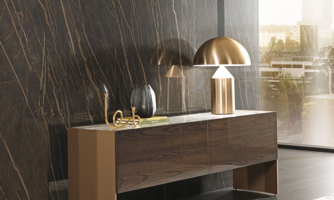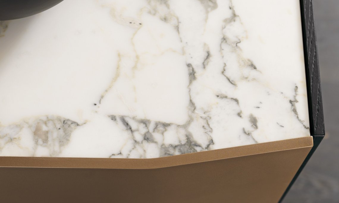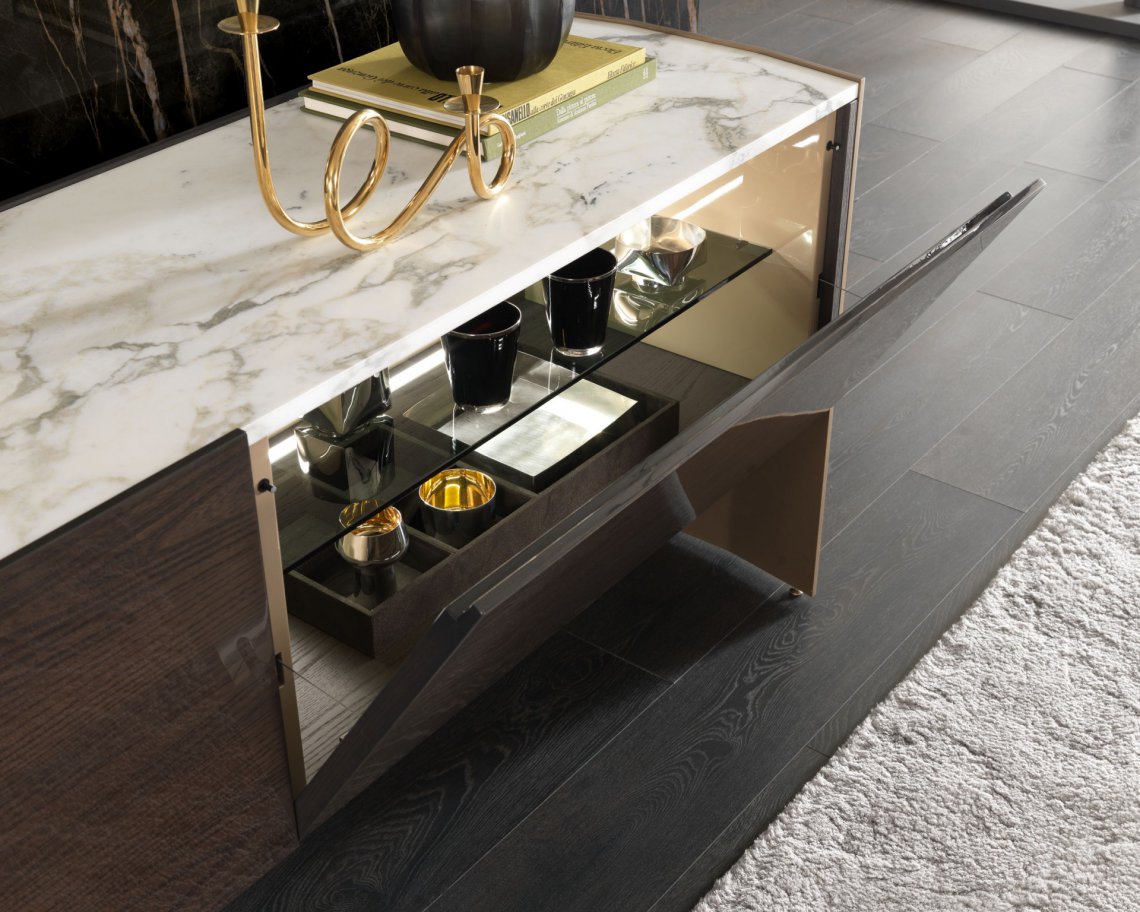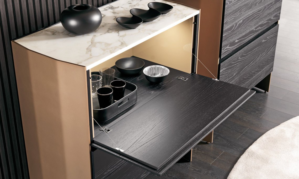槍灰色或者青銅色的鋁合金框架側板,與胡桃木,灰榆木,白蠟木,煙熏橡木或黑橡木,加上珍貴的實木,漆面或大理石等材質構成多種抽屜選擇。再配有原色或者煙熏色玻璃層架,和通常以實木或理石臺面材質的抽屜柜完美匹配,賦予一種本真的意味。