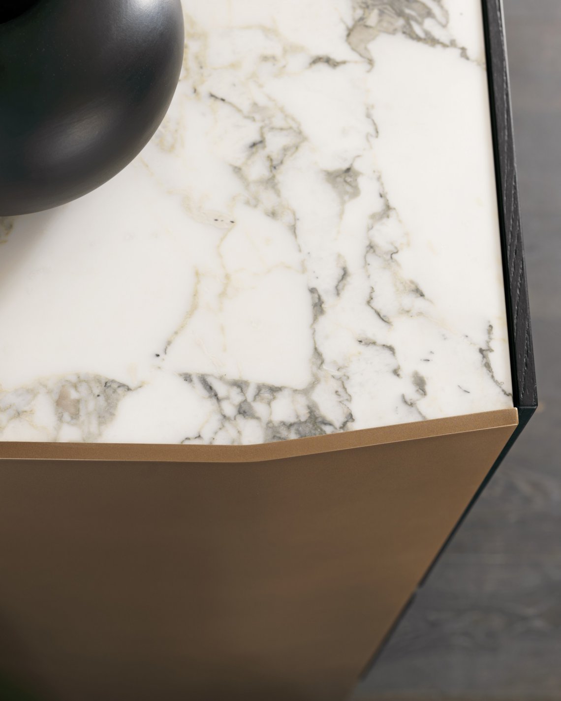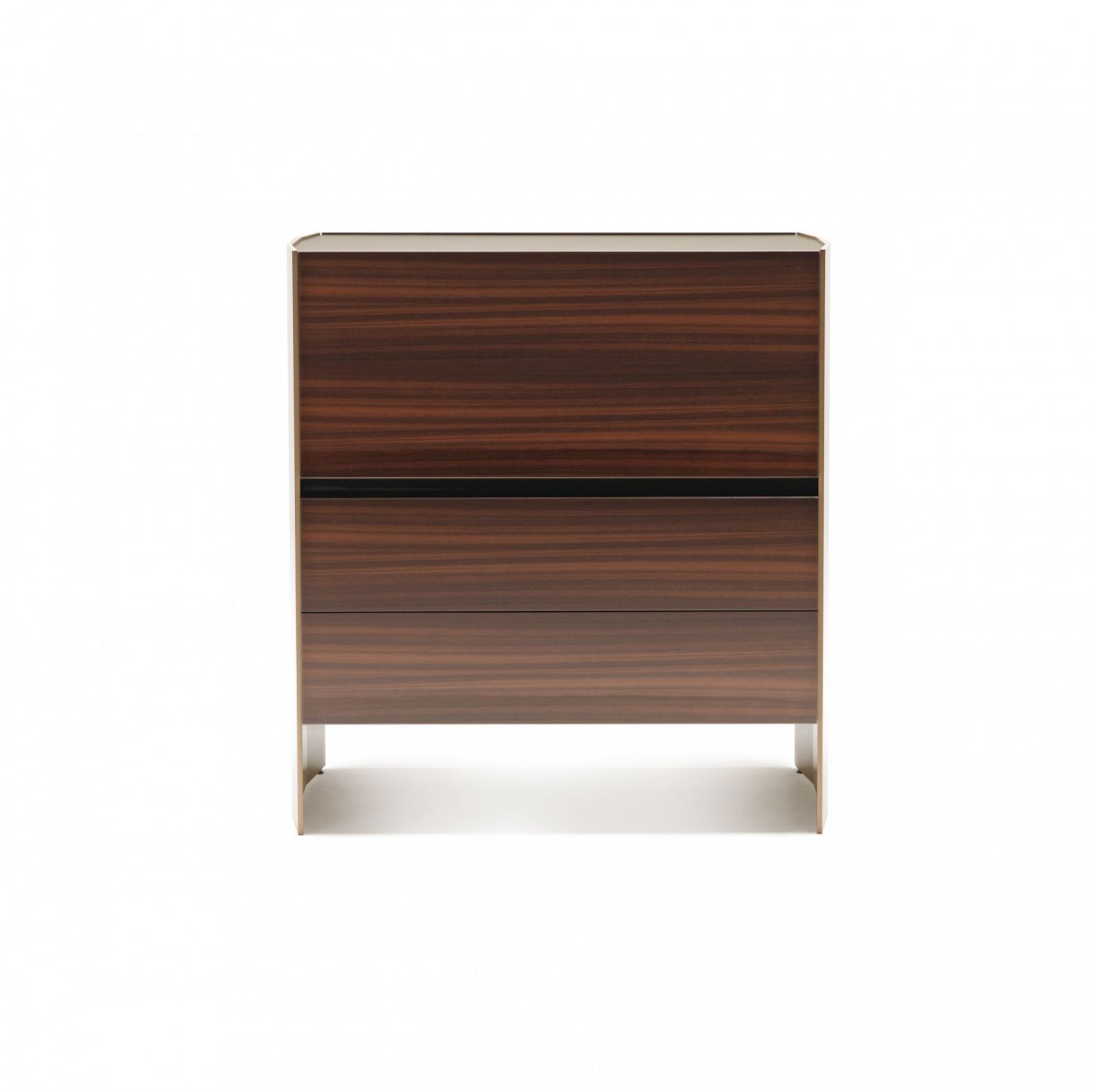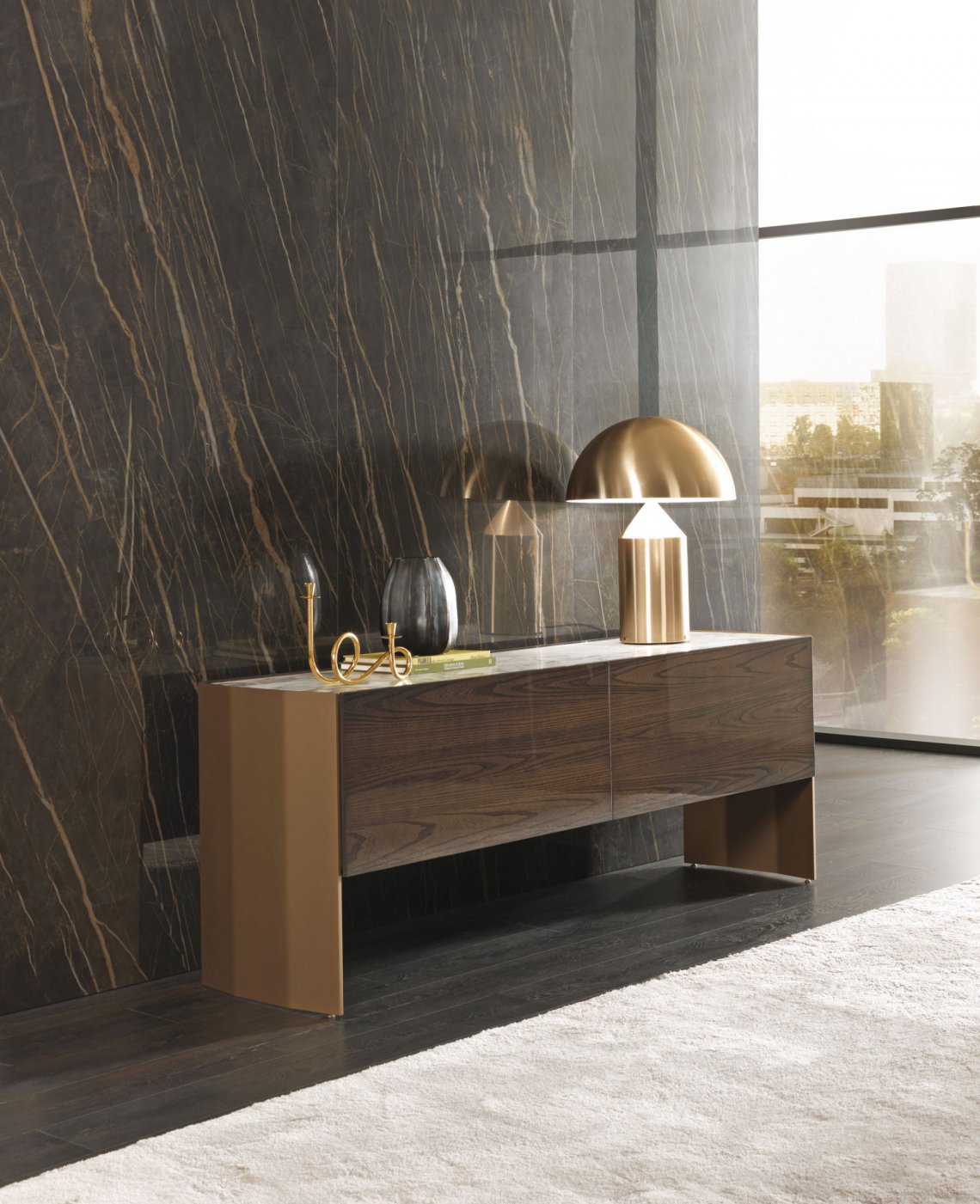 槍灰色或者青銅色的鋁合金框架側板,與胡桃木,灰榆木,白蠟木,煙熏橡木或黑橡木,加上珍貴的實木,漆面或大理石等材質構成多種抽屜選擇。再配有原色或者煙熏色玻璃層架,和通常以實木或理石臺面材質的抽屜柜完美匹配,賦予一種本真的意味。