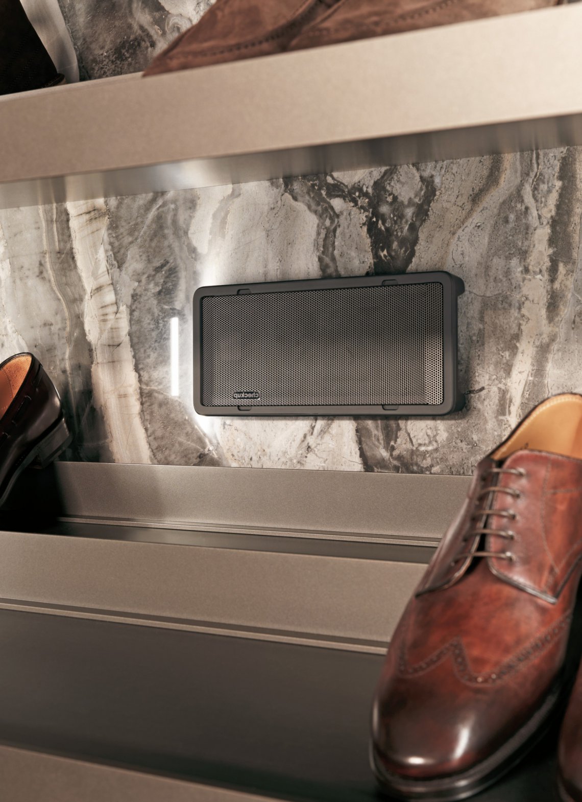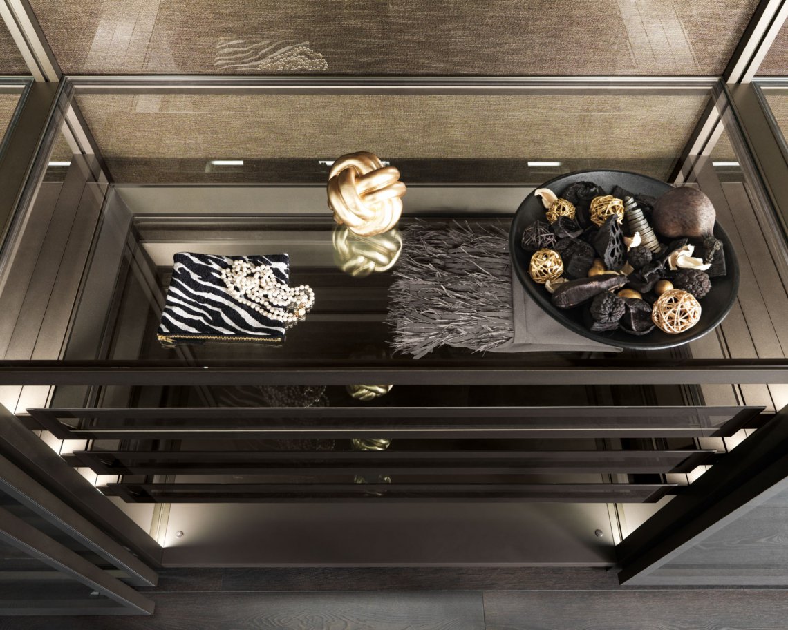 The product is compatible with all the doors already contained in the Palo Alto I-box system, and with the evolution of the Rex door, featuring an innovative opening mechanism, similar to a pantograph, that permits the movement of one or more pairs of doors from their closed position to total 180° opening, placed over the doors of the adjacent compartment. The result is the total opening of spaces of about two meters.
