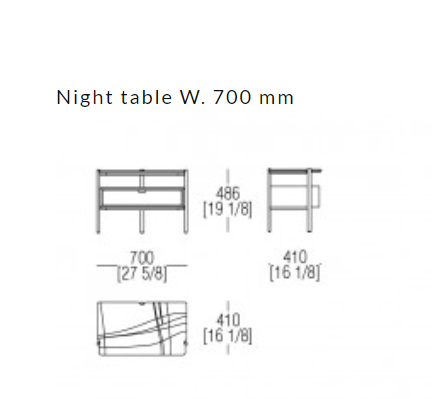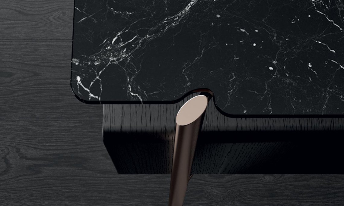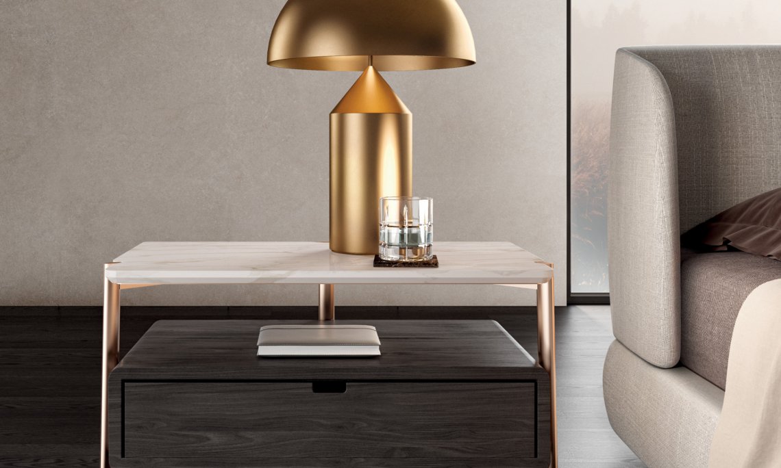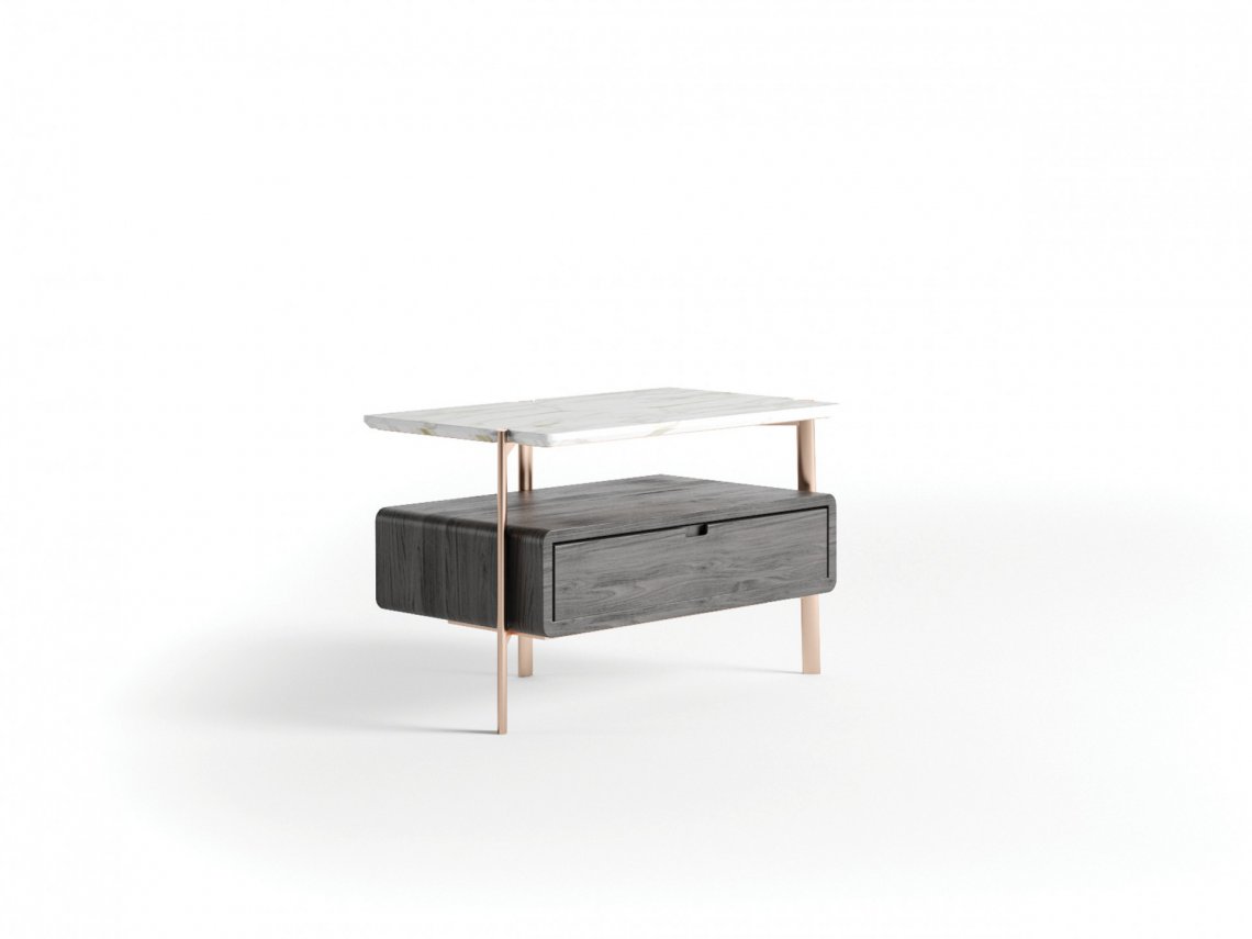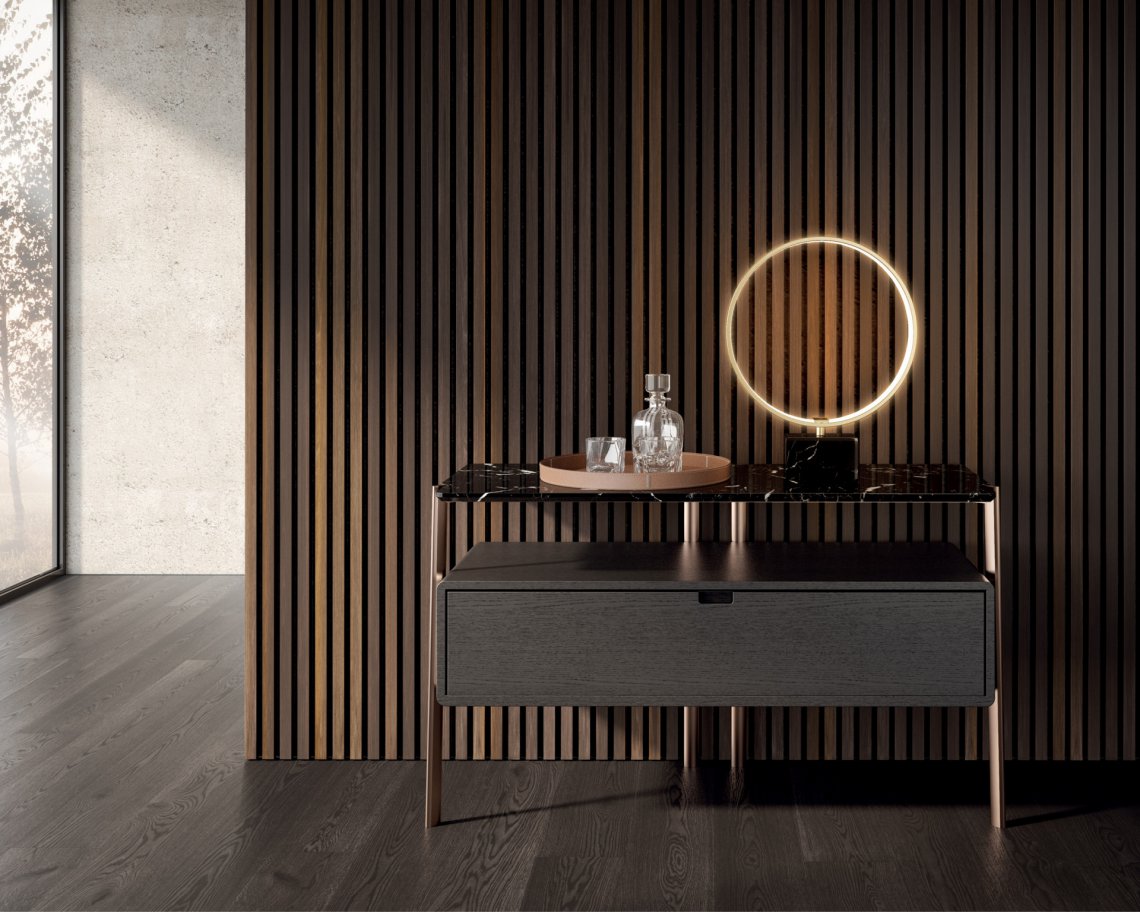 The Eros night group, consisting of a chest of drawers and bedside table, is characterized by the sophisticated dialogue between the different materials that compose it: metal, marble, wood. The bronze painted metal oval diameter structure supports a precious marble support surface through a sophisticated recess inside which it is inserted.
