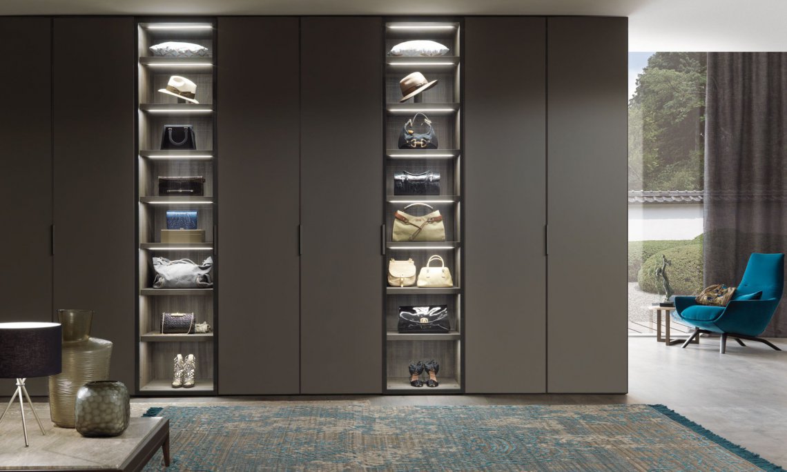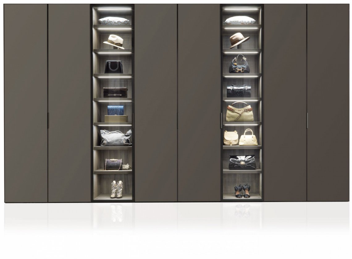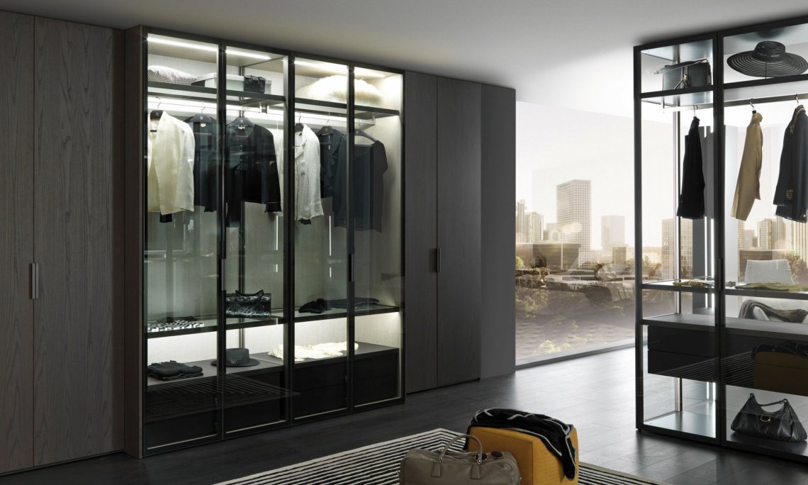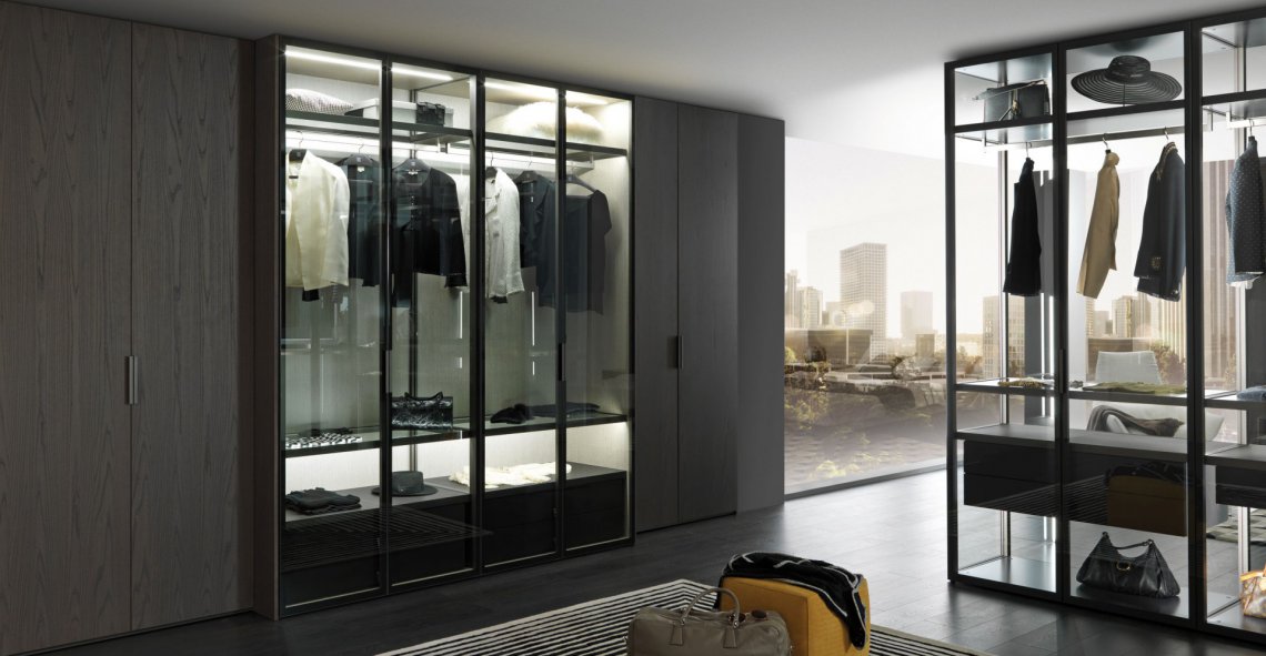 I-Box衣柜系統(tǒng):Narcisse門產(chǎn)品系列由透明玻璃和鍛光鋁合金框架打造,內(nèi)部結(jié)構(gòu)和抽屜柜則是熏橡木美耐板材構(gòu)成,簡約優(yōu)雅的線性設(shè)計(jì)反映傳統(tǒng)價(jià)值和當(dāng)代需求。
