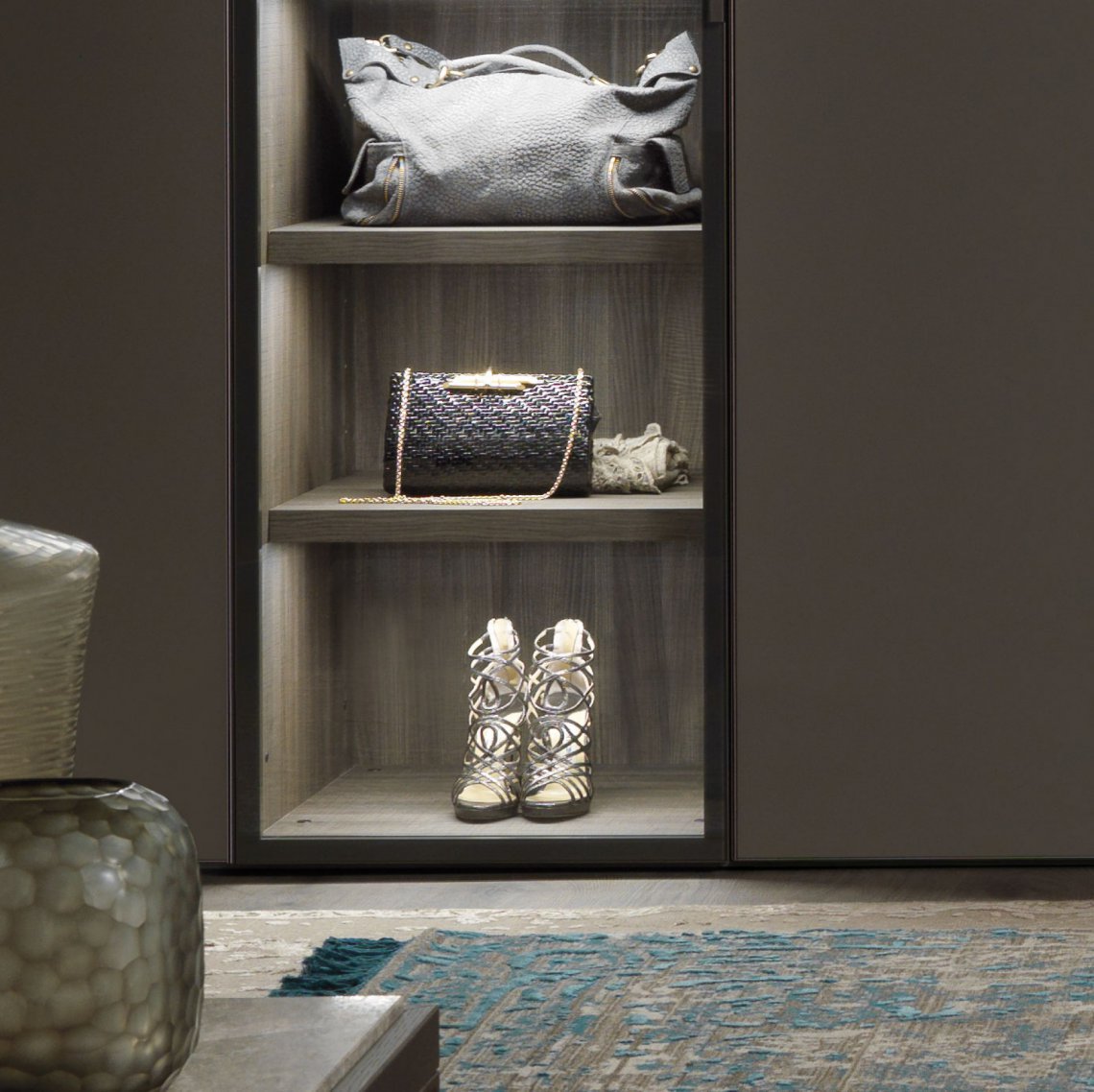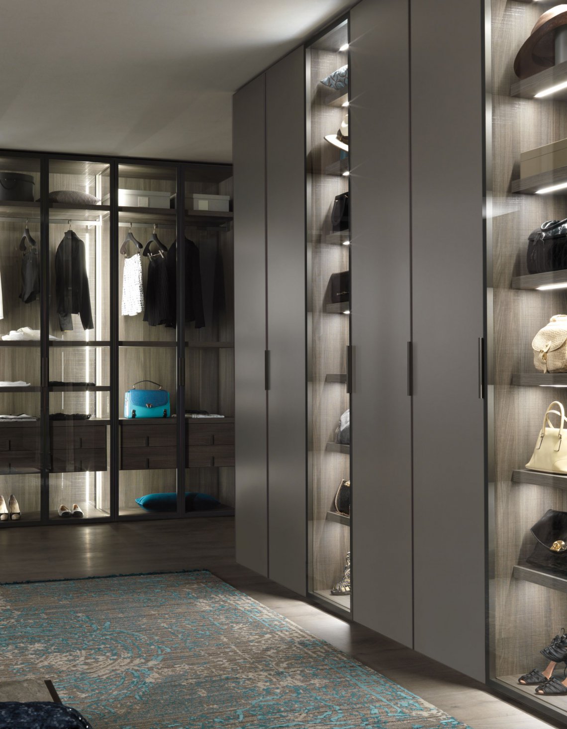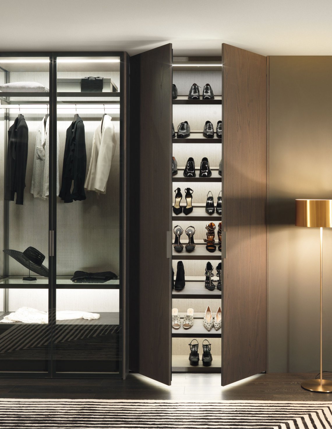 I-Box衣柜系統(tǒng):Narcisse門產(chǎn)品系列由透明玻璃和鍛光鋁合金框架打造,內(nèi)部結(jié)構(gòu)和抽屜柜則是熏橡木美耐板材構(gòu)成,簡約優(yōu)雅的線性設(shè)計(jì)反映傳統(tǒng)價(jià)值和當(dāng)代需求。
