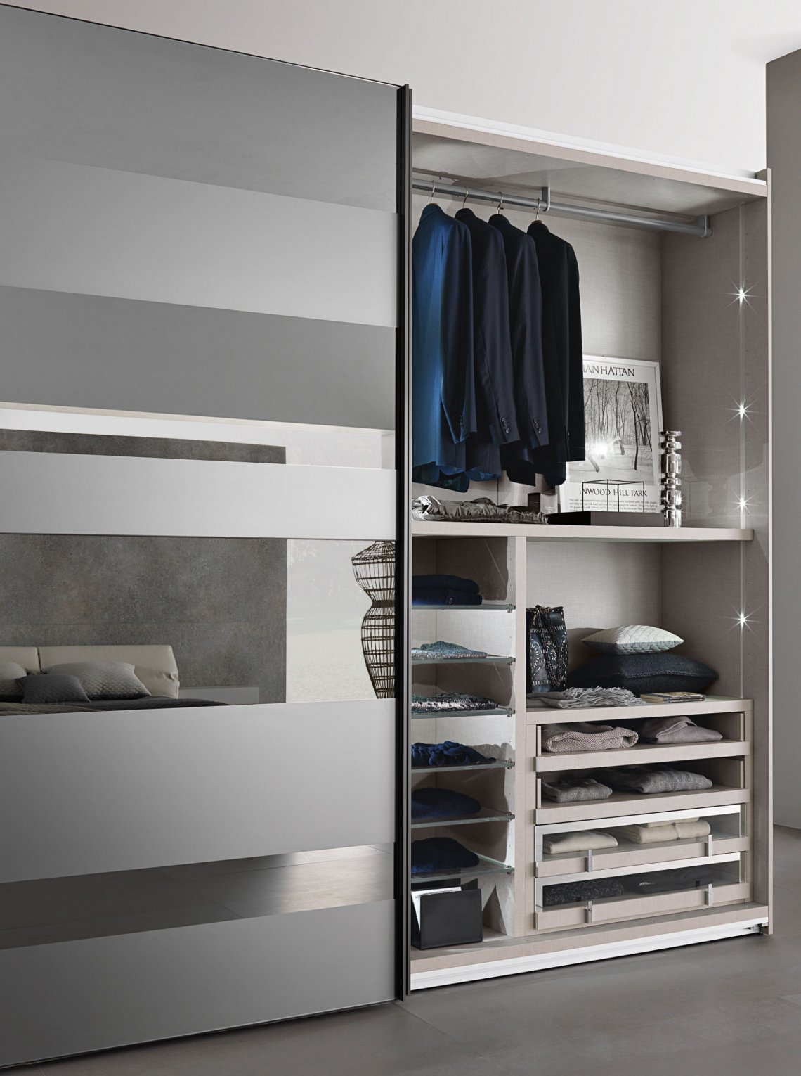 布置房間時,寬敞的衣櫥絕對是一個亮點。Segmenta New移門, 以玻璃、亞光和高光烤漆的交替運用,使衣柜實現個性化。