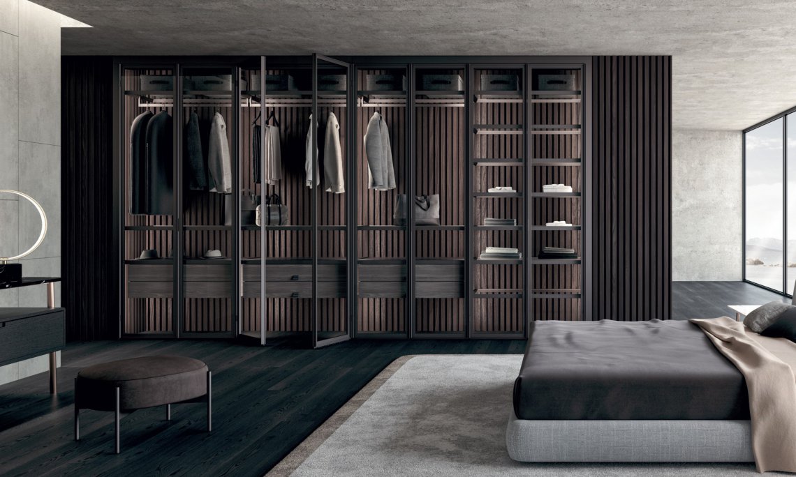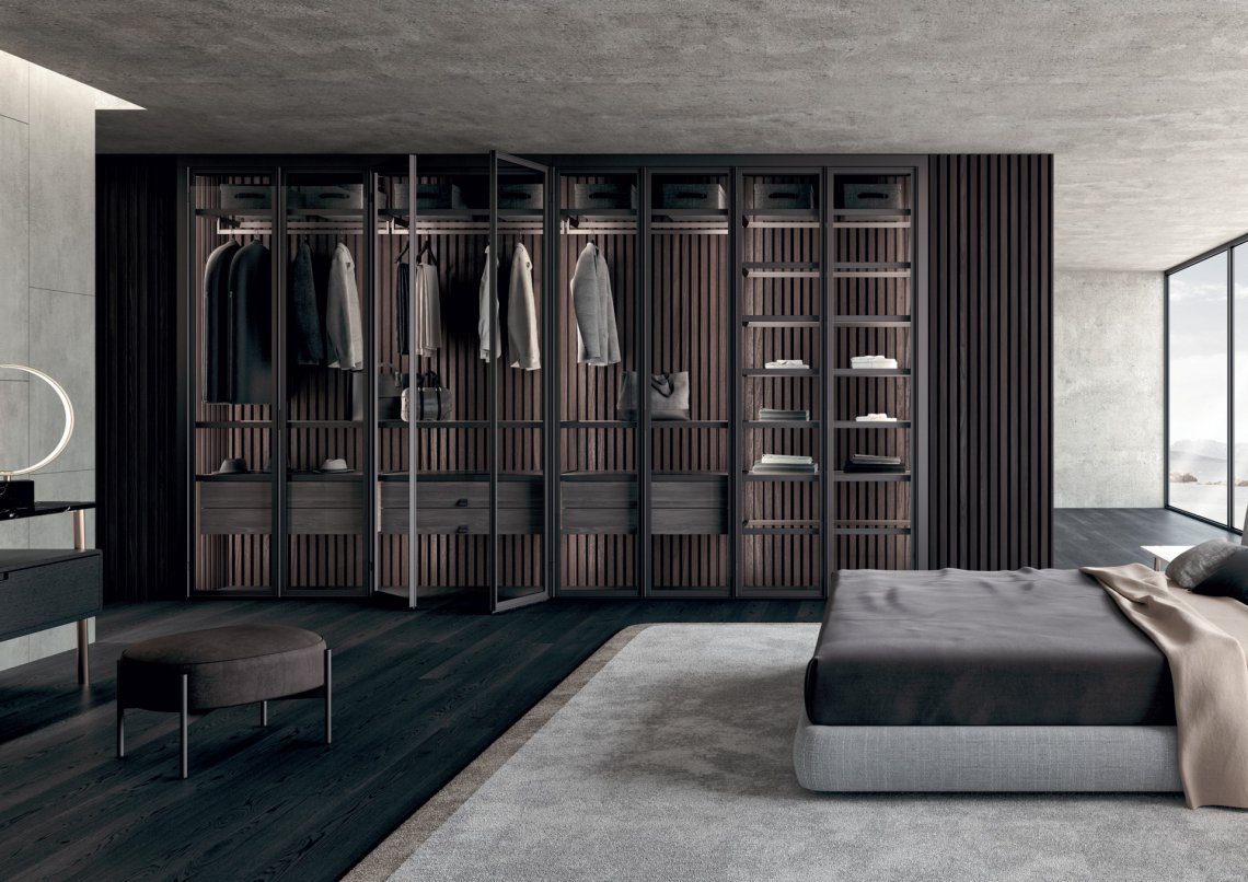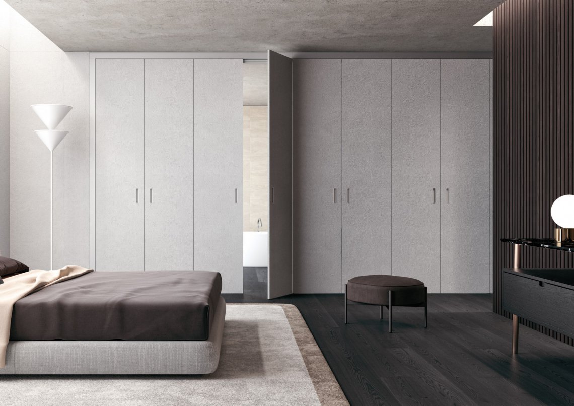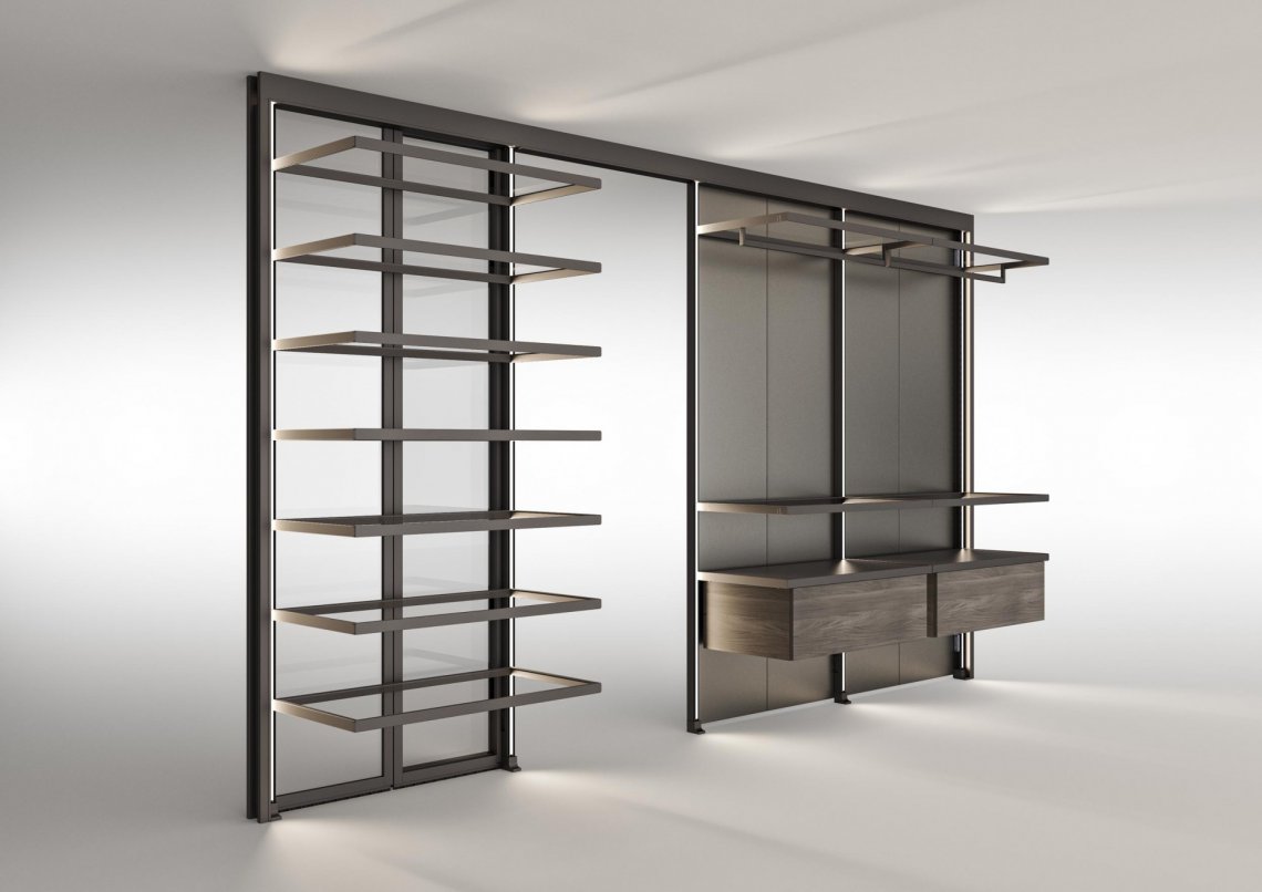 The evolution of Palo Alto I-Box, Palo Alto Free is the new wardrobe concept that calls for the use of doors directly supported by floor-to-ceiling posts that form the structure. This simple system for closing niches or separating spaces sustains a series of accessories for the compartments, similar to those of the Palo Alto I-box.
