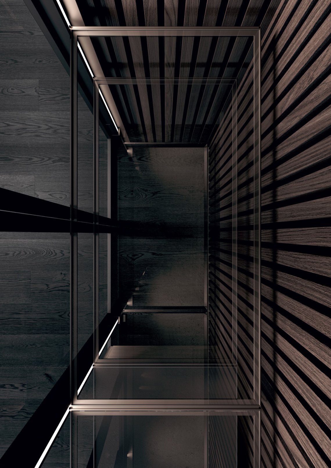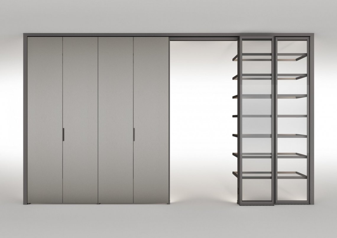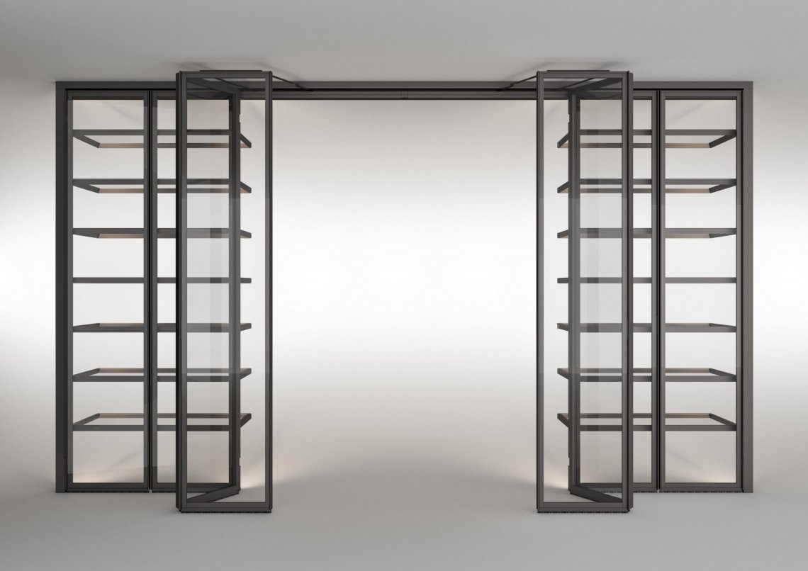 The product is compatible with all the doors already contained in the Palo Alto I-box system, and with the evolution of the Rex door, featuring an innovative opening mechanism, similar to a pantograph, that permits the movement of one or more pairs of doors from their closed position to total 180° opening, placed over the doors of the adjacent compartment. The result is the total opening of spaces of about two meters.