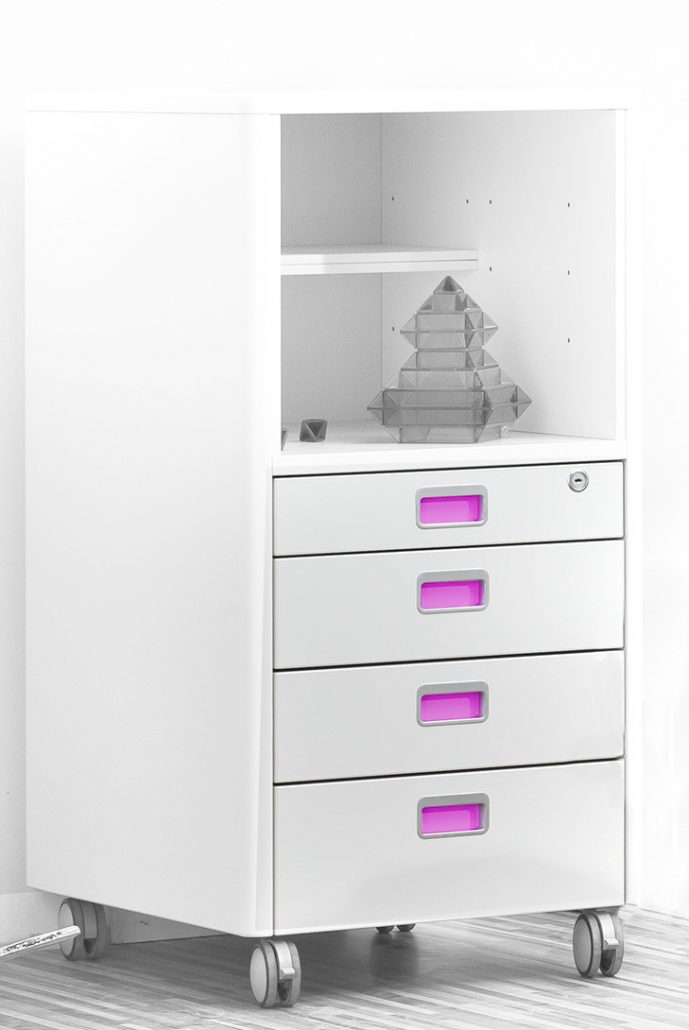 The larger alternative to Cubic offers an additional drawer and two more tray compartments. Cubicmax also has castors and comes with 8 different color applications for the handles. In addition to more storage space, it also offers the possibility of doing one or two activities while standing.