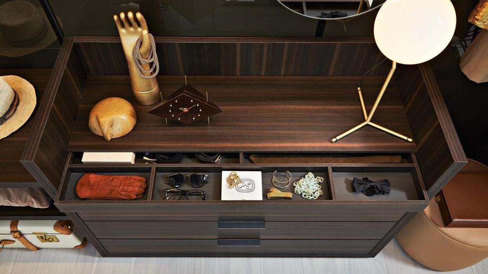 Gliss Master中島是一個(gè)居中放置的獨(dú)立單元,落地?cái)[放,使一個(gè)步入式衣帽間或者封閉區(qū)域的衣柜空間更加完整。儲(chǔ)物格盤,透明玻璃面板抽屜,優(yōu)雅的生態(tài)皮革層板都是其特色元素之一。