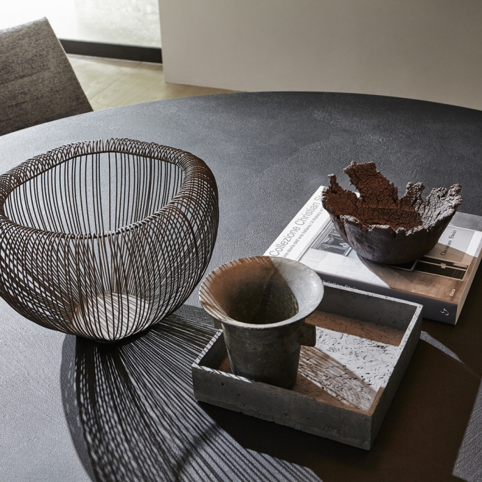 Asterias是原產于墨西哥山區的一種仙人掌,也是Patricia Urquiola所設計的產品的名字。圓桌尺寸較大,中間的支撐柱與仙人掌的形狀相呼應。支撐柱實際上由六面曲木板組成,形成六面體,側壁結合處向外凸出。采用3D打印成型特定技術制成。桌面采用(160或180厘米)圓形邊緣,桌面上分成四個區域,形成有趣的幾何設計。圓桌還配有一個實用的配件;中央轉盤(Lazy Susan),深受亞洲國家喜愛。