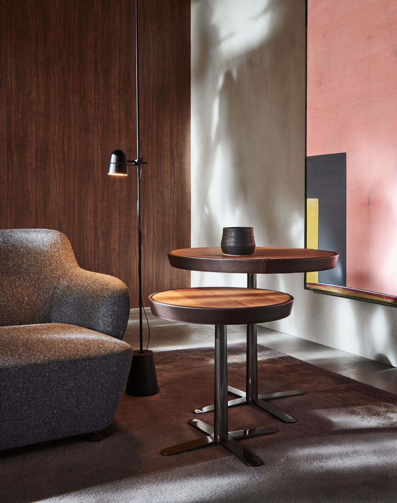 小桌的桌面可以采用大理石或木制材質,下部略收的側邊框始終采用皮革。