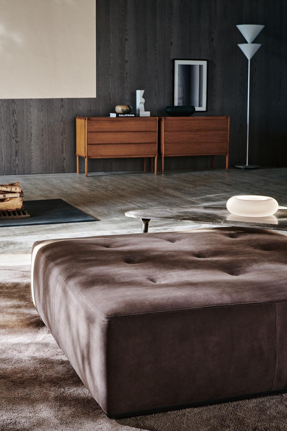 設計簡單而精致的新系列無靠背沙發。兩種不同而互補的版本,均由恢弘而硬朗的幾何形式構成,手工縫制的座位點綴其中。一個是懸空的版本,座位是靠錫金屬打造的金屬底座支撐。另一個是席地版本,最有安全感的幾何形狀搭配幾不可見的錫金屬邊框點綴。兩種不同的尺寸迎合當代裝修的多種需求。