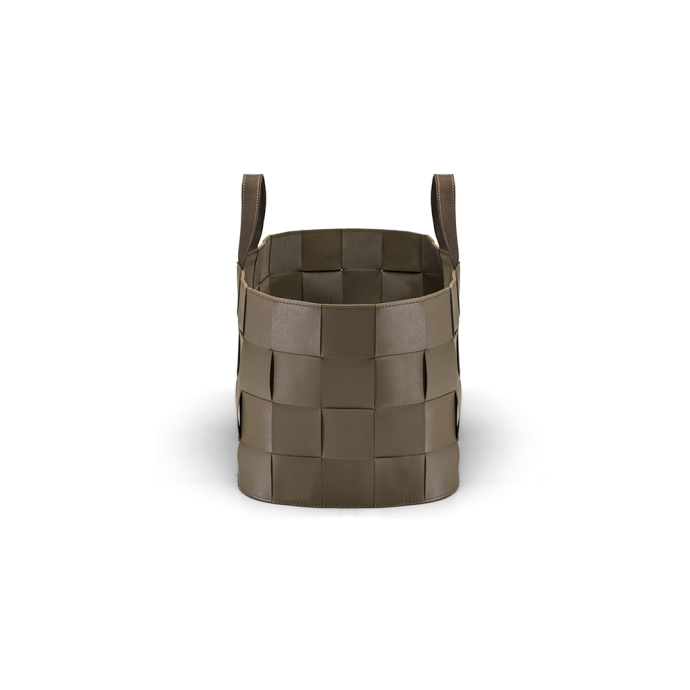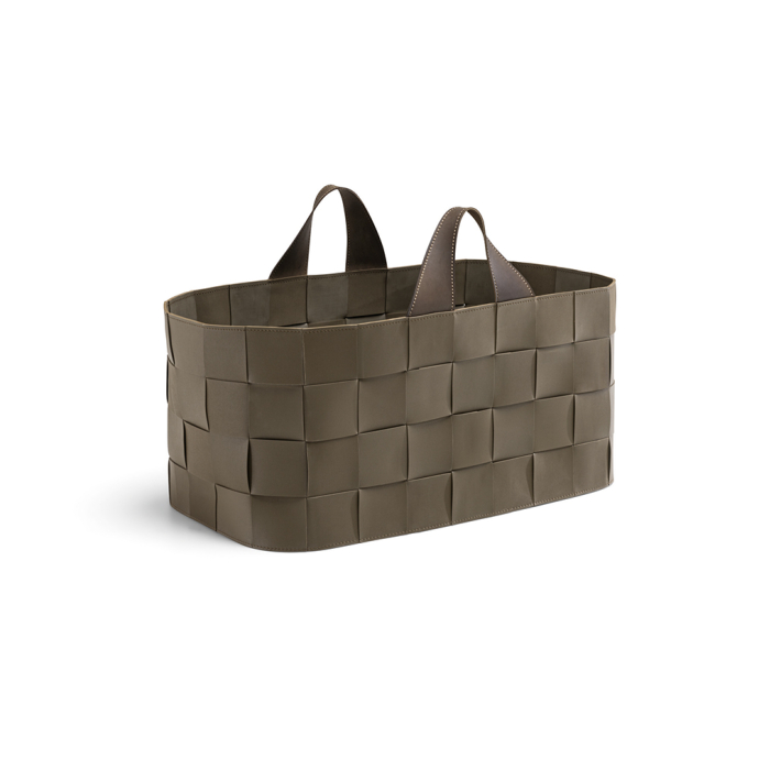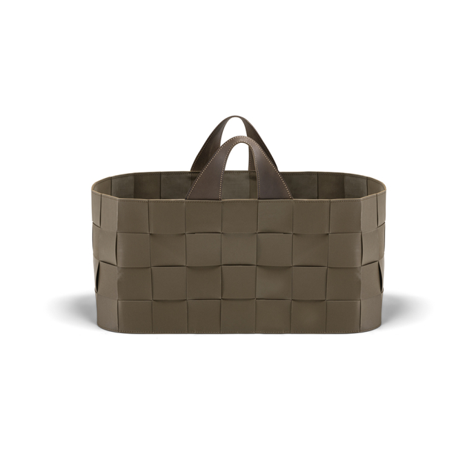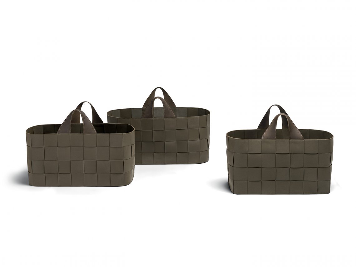 They take up the weave theme common to the two outdoor collections, here expressed in the simple warp and weft motif, made of strips of the same size as Hyde pouffe. For reasons of resistance, the baskets are made entirely of olive-green EVA polyurethane.