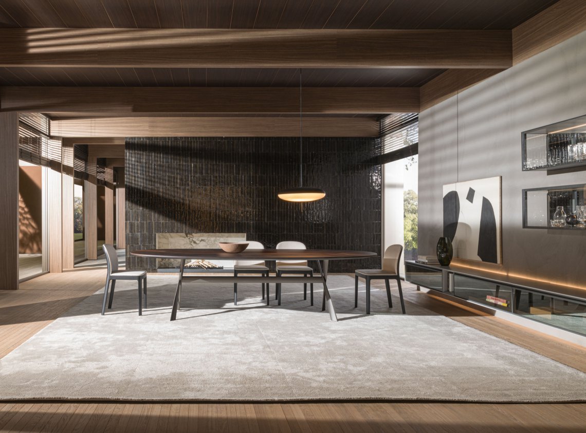 Gatwick, a table designed in 2019 by the architect Rodolfo Dordoni, has been renewed by providing the aluminium structure with a new Eucalyptus top featuring a sophisticated inlay design, in addition to the marble variants, already available in the Molteni&C collection.