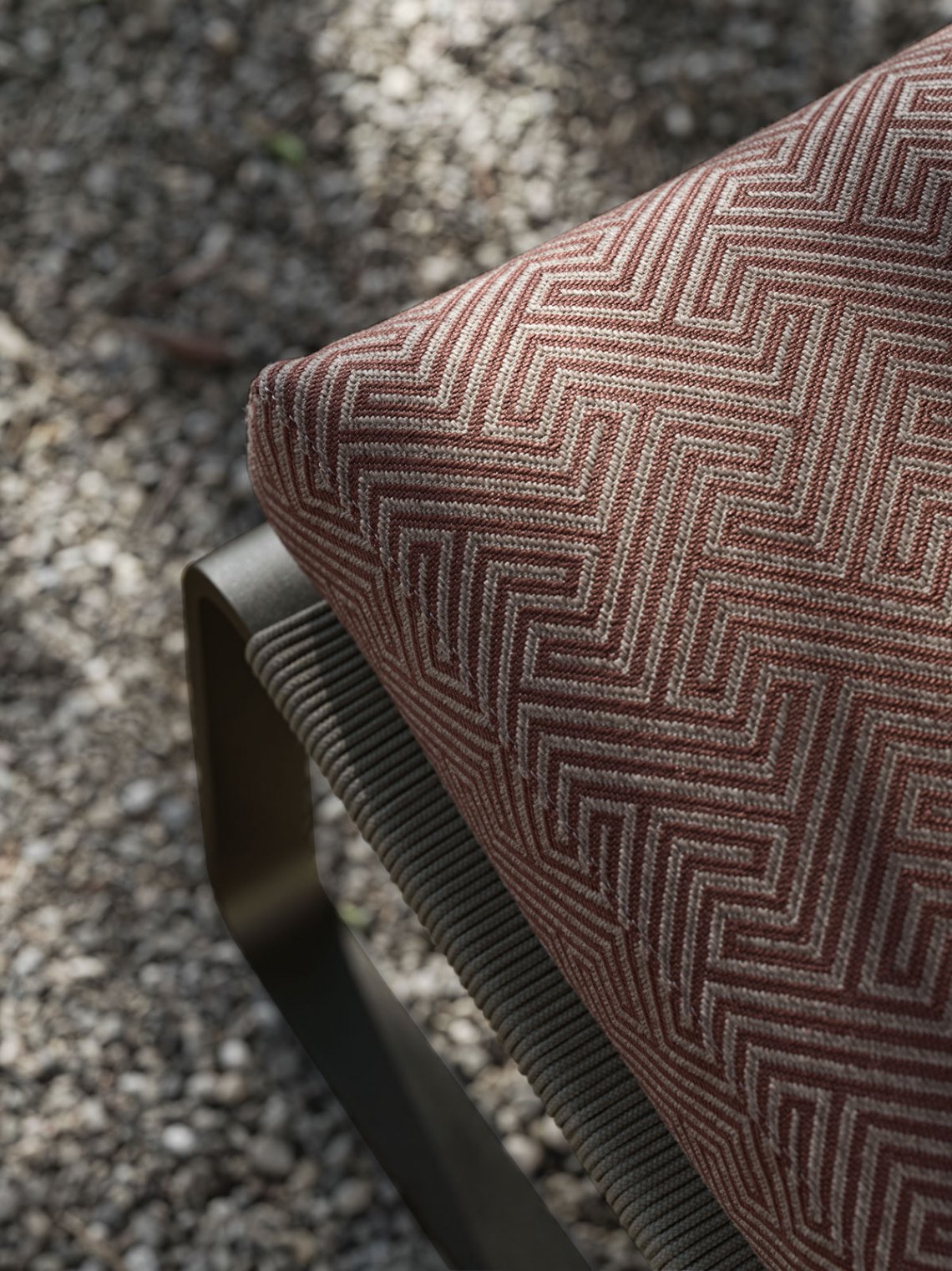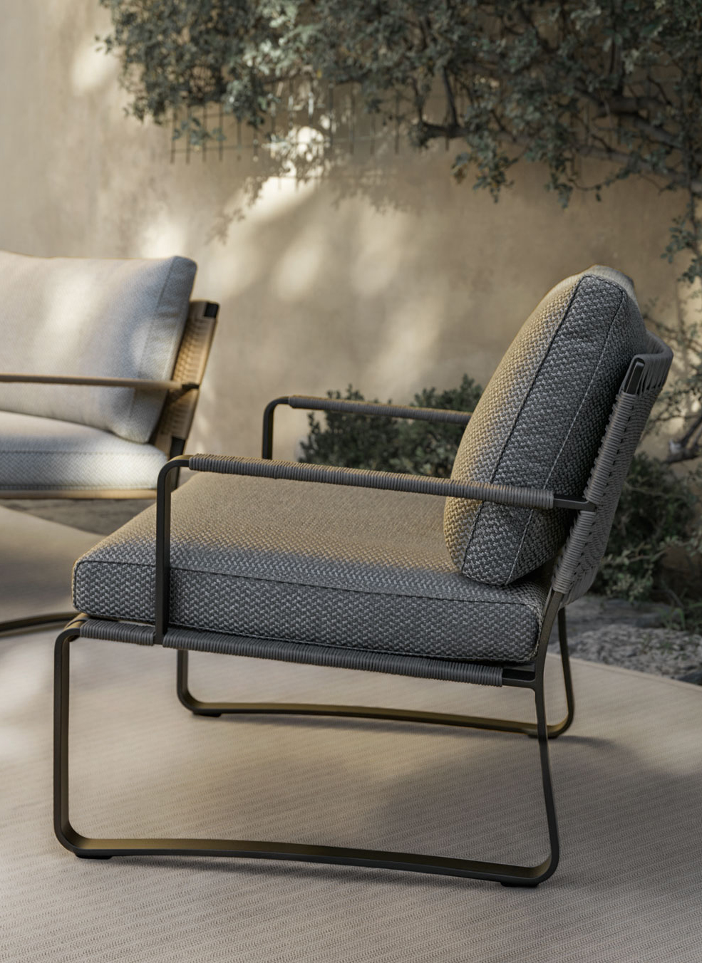 A dense, handcrafted polypropylene rope cover is woven onto the metal frame in anthracite, olive green and desert yellow. In addition to the armchair and chairs, the range includes a large array of products, such as a dining table with seats, a stool, a comfortable sunbed, side tables and a bench.
