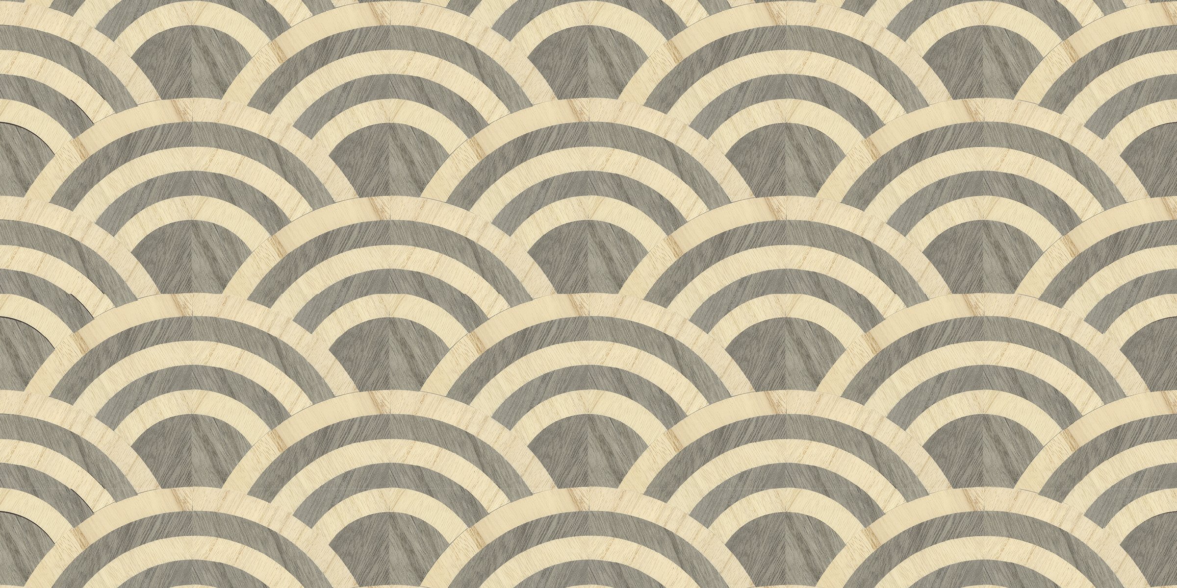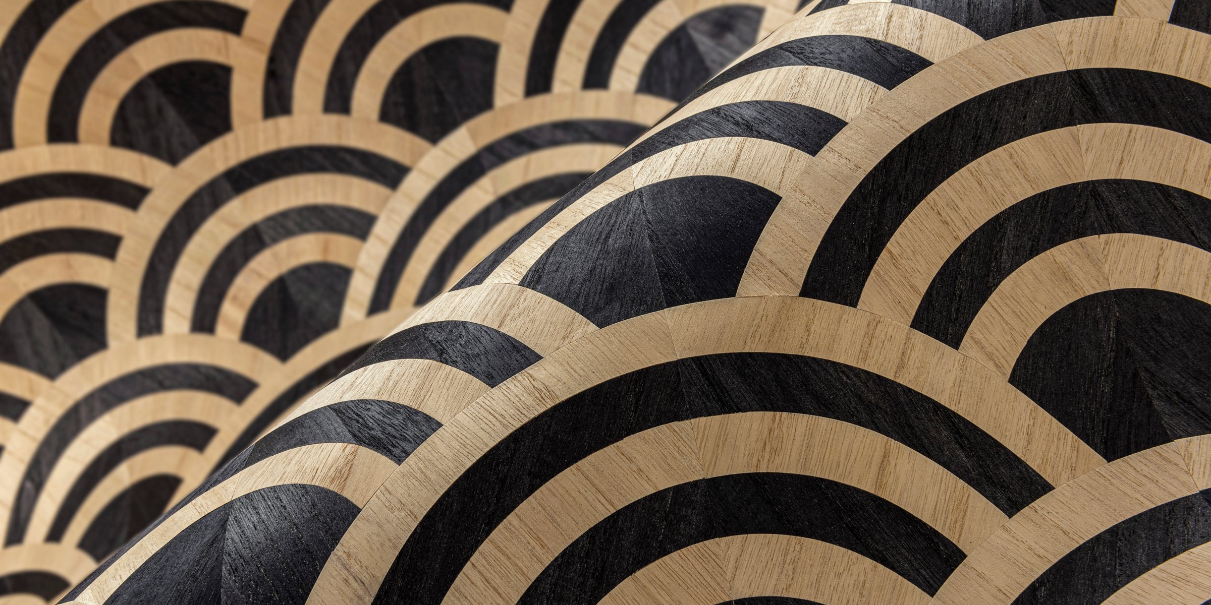 Overlapping O’s, created of wood veneer marquetry inlay, resemble the rolling waves of the ocean. The unique wallcovering’s ancient Seigaiha pattern symbolising waves of water represents good luck, power, and resilience.