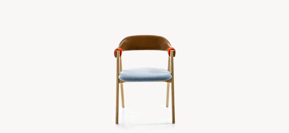 imbottita. Copribraccioli a fascia in pelle o tessuto. Mathilda non è sfoderabile. Sedia impilabile fino a 3 pezzi.