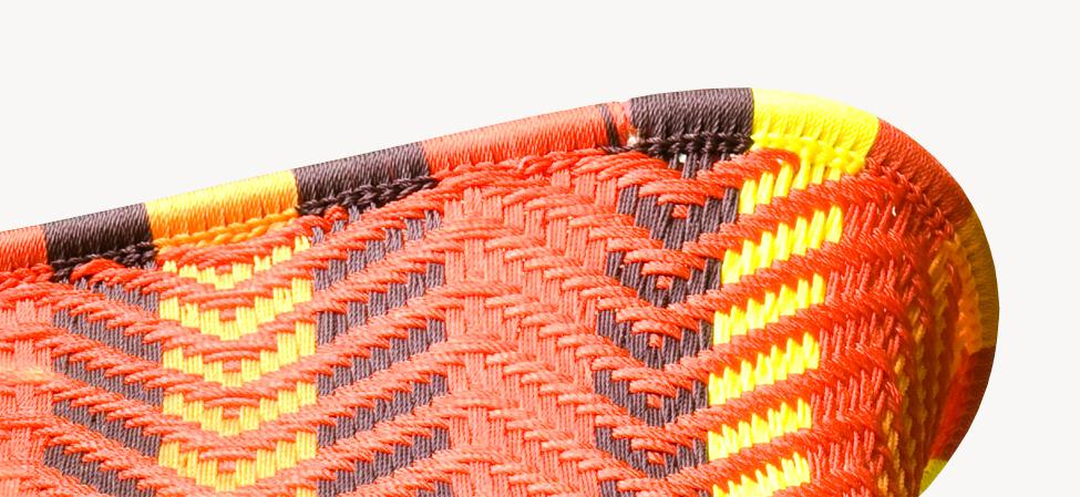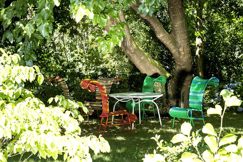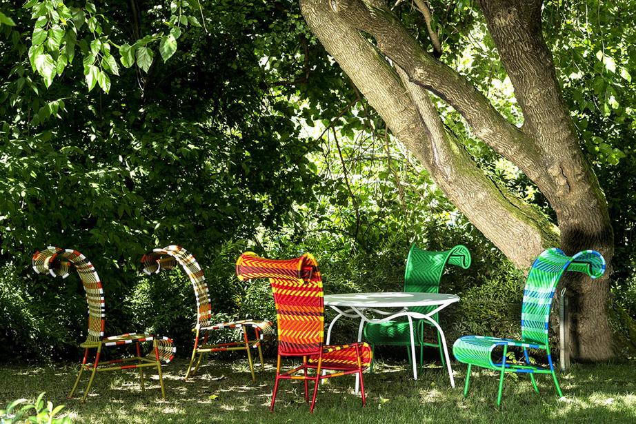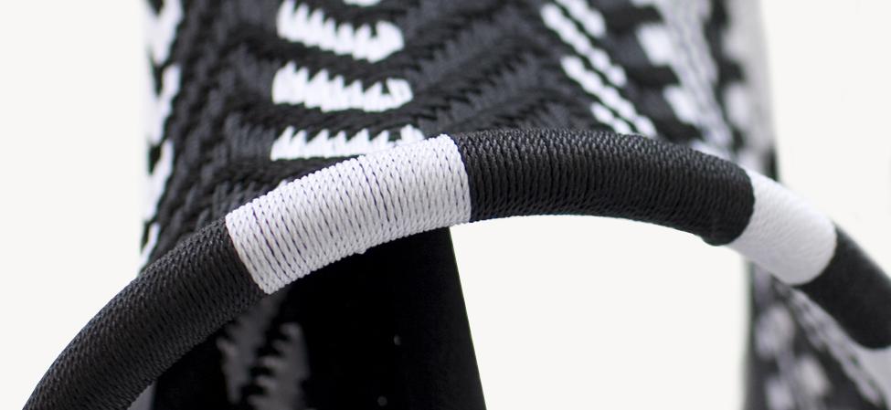 Struttura in acciaio verniciato e fili colorati in polietilene intrecciati a mano. Sottopiedi in PVC.