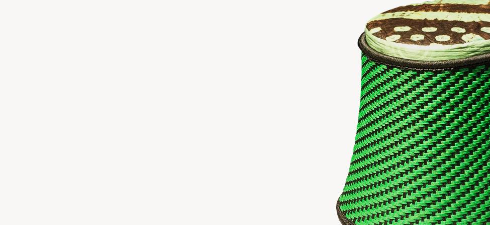Struttura in acciaio verniciato e fili colorati in polietilene intrecciati a mano. Il pouf è corredato da un cuscino in tessuto stampato. Consigliato per interni solamente.