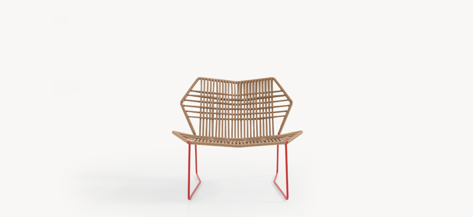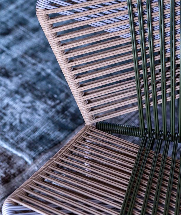 Struttura in acciaio inox o verniciato per uso esterno. Sottopiedi in PVC. Intreccio in filo tecnopolimero.