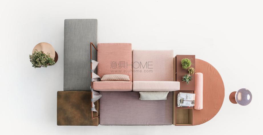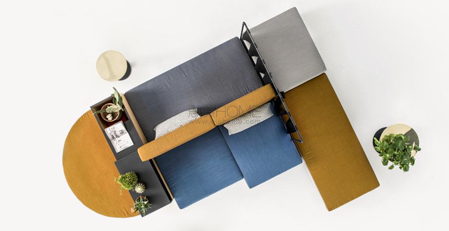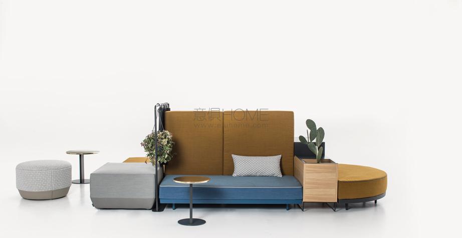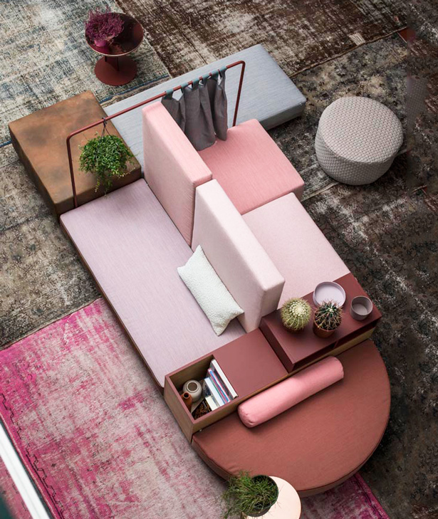 Progettare le relazioni, disegnare traiettorie per appropriarsi degli spazi che l’attualità dispone. Bikini è un paesaggio figlio del tempo e della società che lo esprime. Aree d’attesa, ambiente domestico, la flessibilità componitiva è legata alla mancata necessità di una corrispondenza tra conformazione dello spazio e disposizione degli elementi del sistema, che per varietà estetica e funzionale permettono una non comune trasversalità d’utilizzo. Sgabelli, tavoli, attaccapanni, contenitori, scaffali, separé, piani di appoggio e di seduta: ogni elemento concorre alla relazione e all’interazione. Un intreccio di funzioni e significati che sposta l’idea del divano da fronte televisivo o luogo del riposo a epicentro (aperto) di relazione.