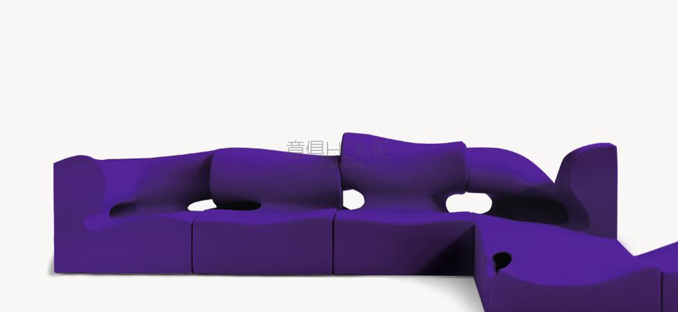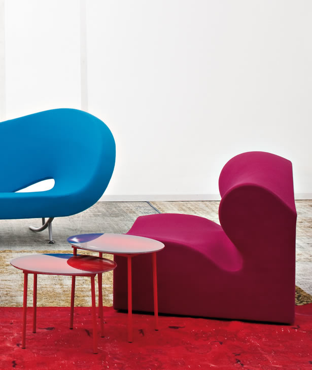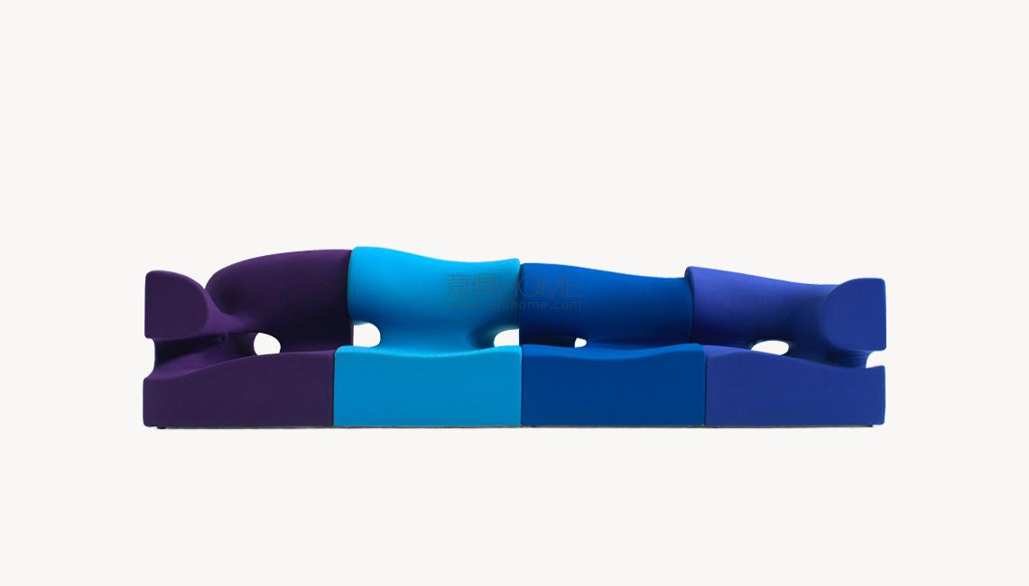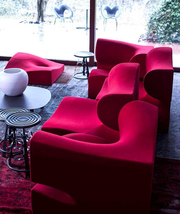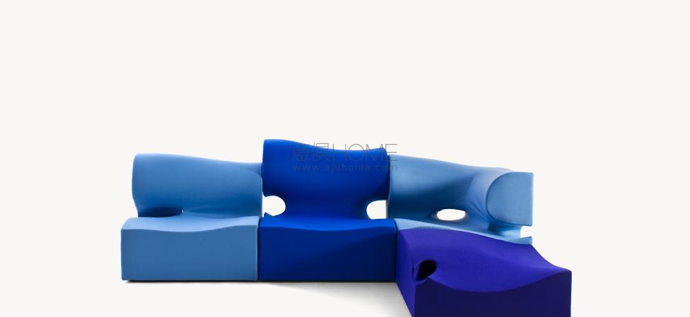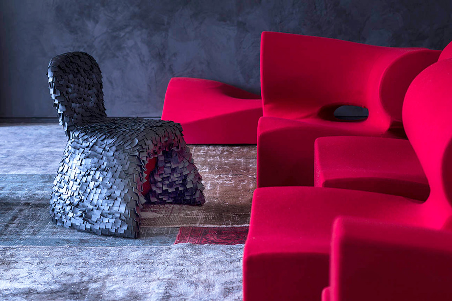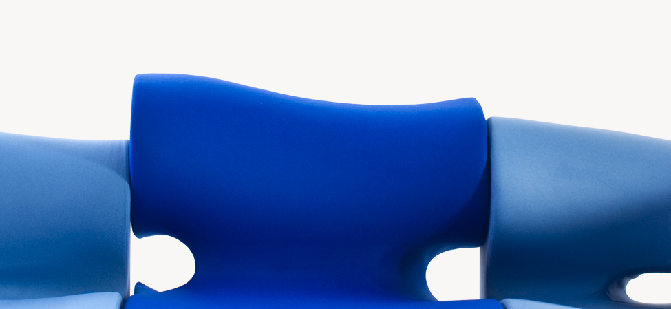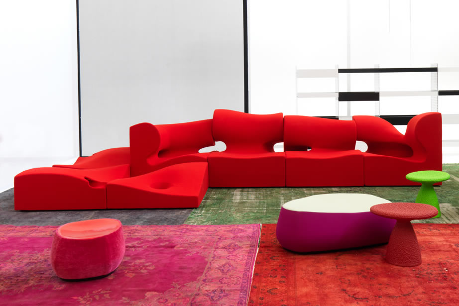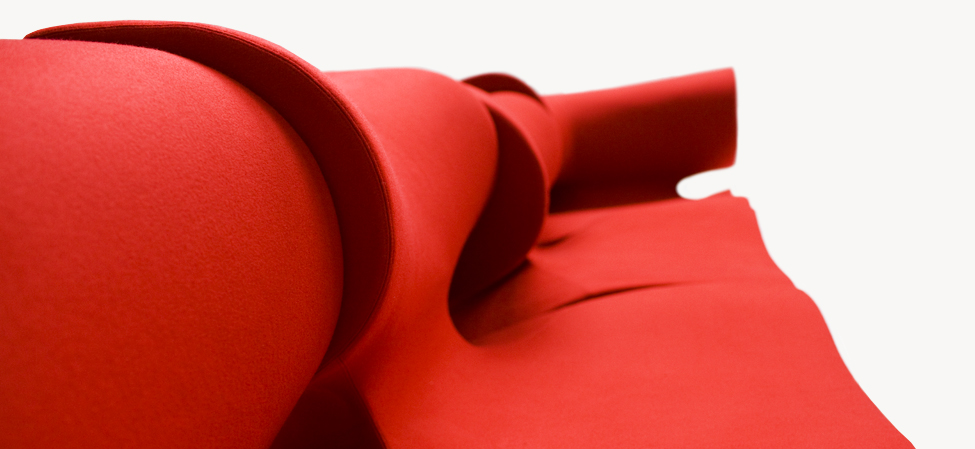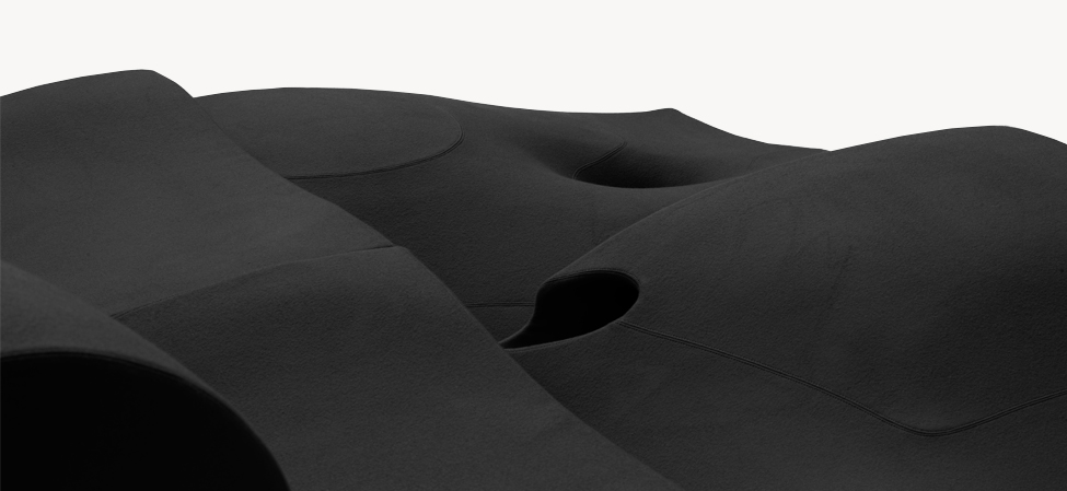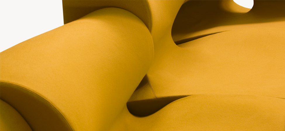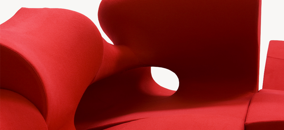 Il designer modella, scava, taglia, si sostituisce alla forza della natura. Sotto non c’è pietra, o metallo, ma poliuretano espanso schiumato ad acqua. L’intenzione è quella di creare un insieme di sedute componibili; la condotta però è libera, passionale, non soggetta alle regole razionali della progettazione industriale. Ogni singolo modulo è indipendente; nell’accostamento, deliberatamente, non è ricercata la corrispondenza; la continuità, nell’irregolarità, è materica e formale. Per i maestri artigiani di Moroso, nel far aderire alle linee curve e al gioco volumetrico di pieni e vuoti il tessuto di rivestimento, una sfida manifatturiera. Il risultato, un’icona della contemporaneità.