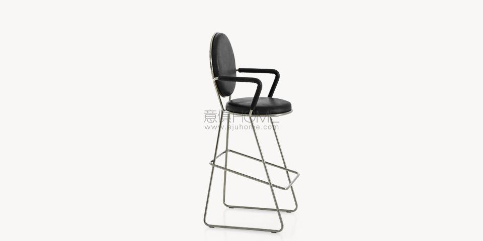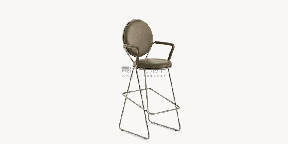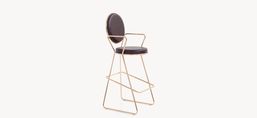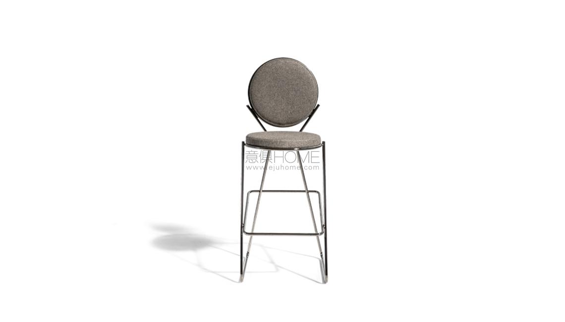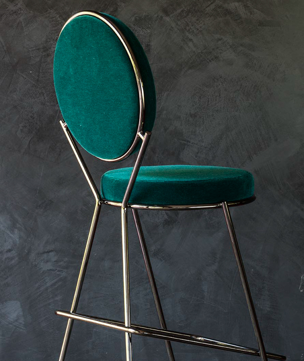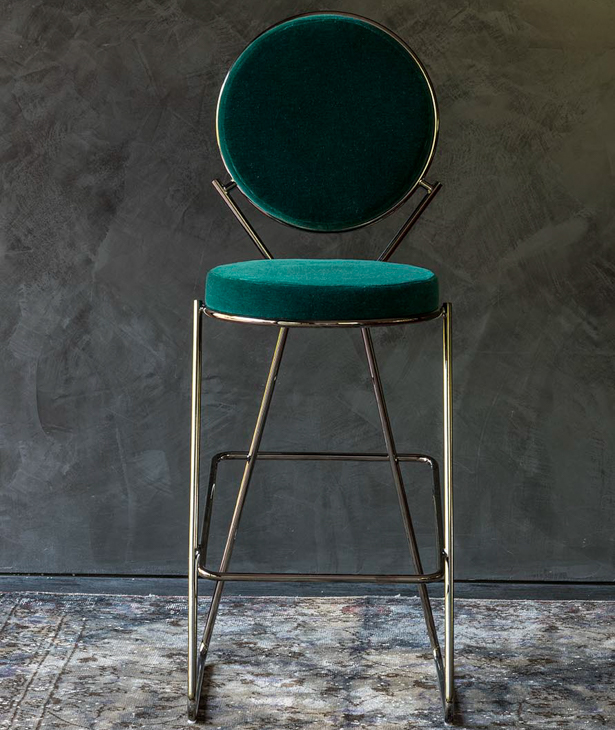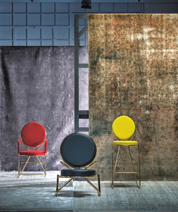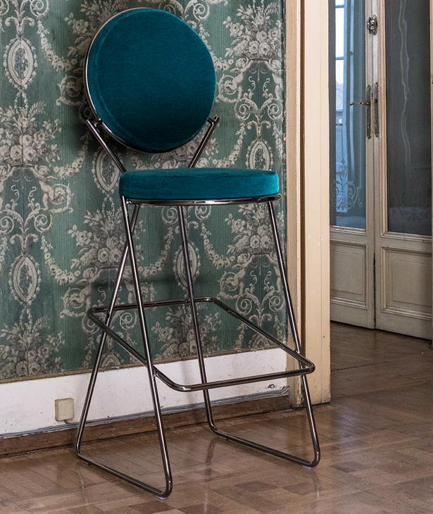 Due cerchi, due moduli elementari innestati in una geometria costruttiva di ispirazione déco, comunicano apertamente la tendenza alla massima semplificazione formale. è il preludio a una produzione industriale di altissima qualità, un’elegante economia di volumi espressa dalla possibilità, offerta dalla struttura in tubolare di acciaio cromato, di declinare il progetto in una famiglia di sedute completa. Nascono così una sedia e uno sgabello, con e senza braccioli, ai quali si aggiunge un divanetto a due posti, raffinata evoluzione formale dettata dalla classe e dal buon gusto. è un ritorno all’ordine, transizione verso un linguaggio lussuoso e sintetico insieme.
