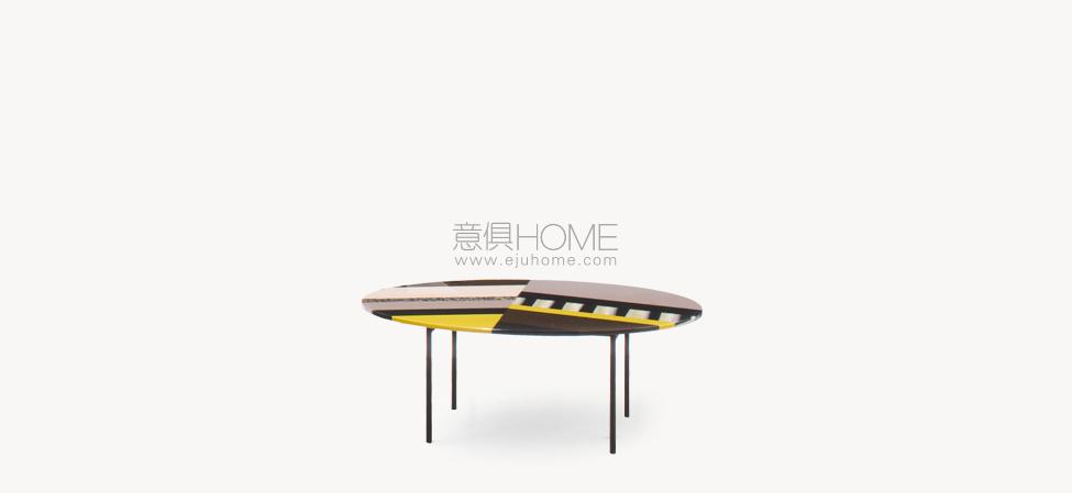 Top in Sintetica? metacrilato colorato e decorato a mano. Tagliato e composto come disegni riportati. Base in acciaio verniciato a polveri nero opaco. Sottopiedi in polipropilene.