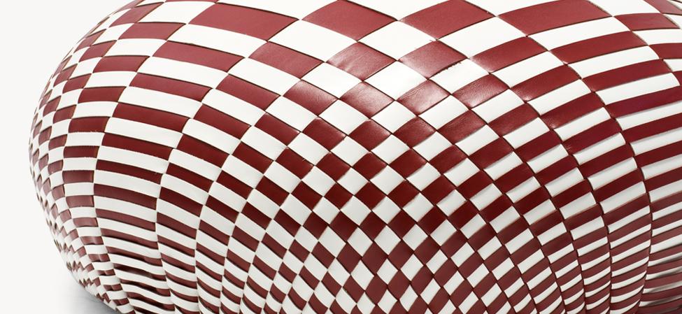 Un pouf rotondo come una goccia d’acqua, dove le linee della tensione superficiale si trasformano in un intreccio di strisce di pelle. Come per alcune opere optical degli anni ’50, Nendo studia i processi percettivi alla base del movimento, traducendoli in una disposizione di linee e forme geometriche organizzate secondo un preciso approccio matematico. L’effetto ottico, enfatizzato dai rapporti di estensione e dall’uso del bianco e nero, nella sua semplicità permette una lettura multipla dell’oggetto, allo stesso tempo strutturale e di superficie.