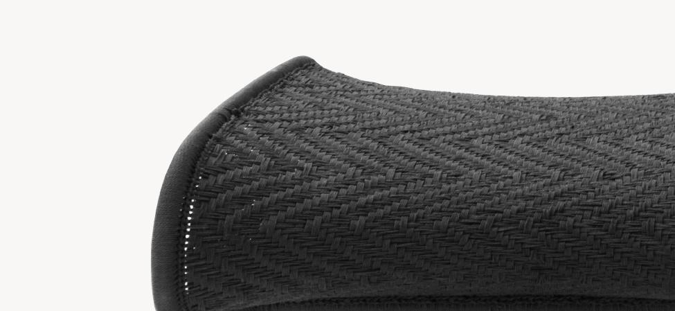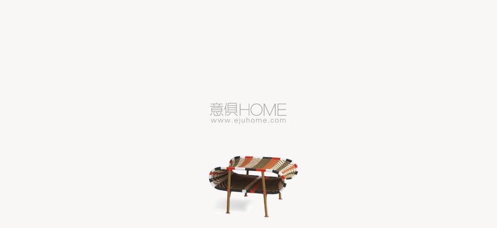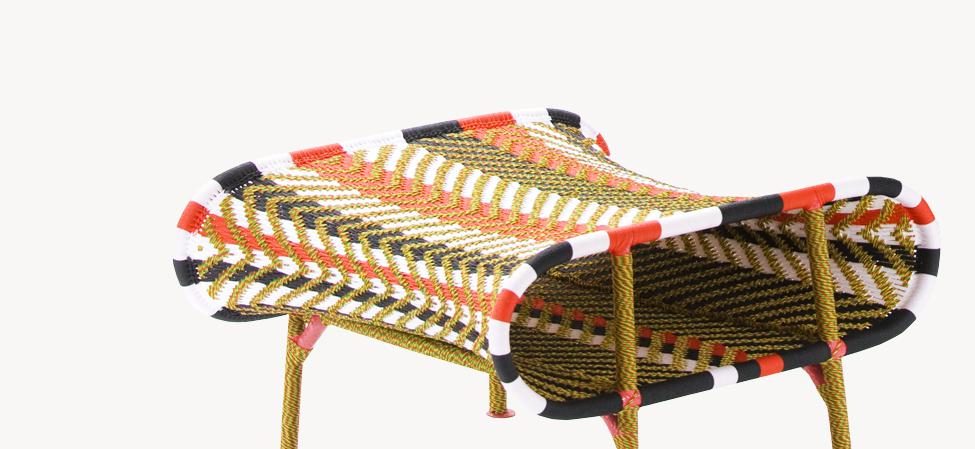 Struttura in acciaio verniciato e fili colorati in polietilene intrecciati a mano. Sottopiedi in PVC.