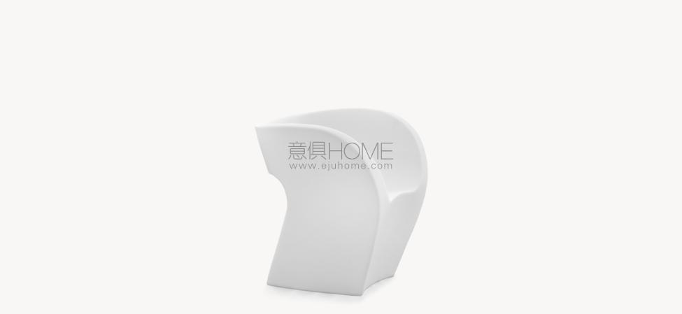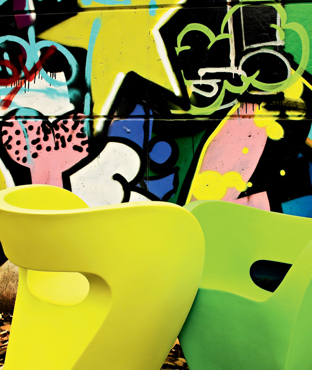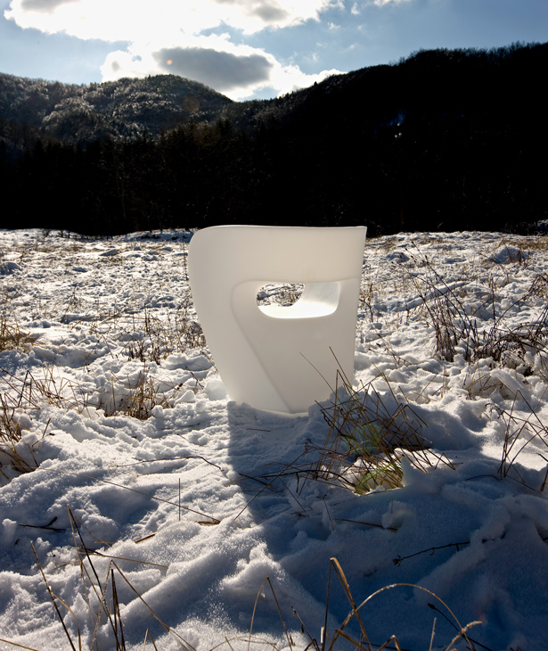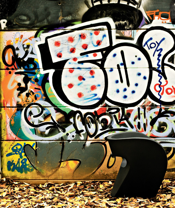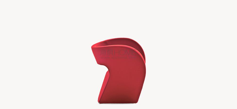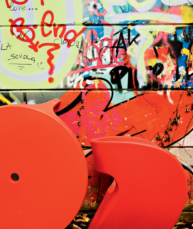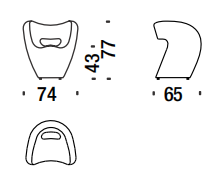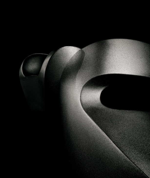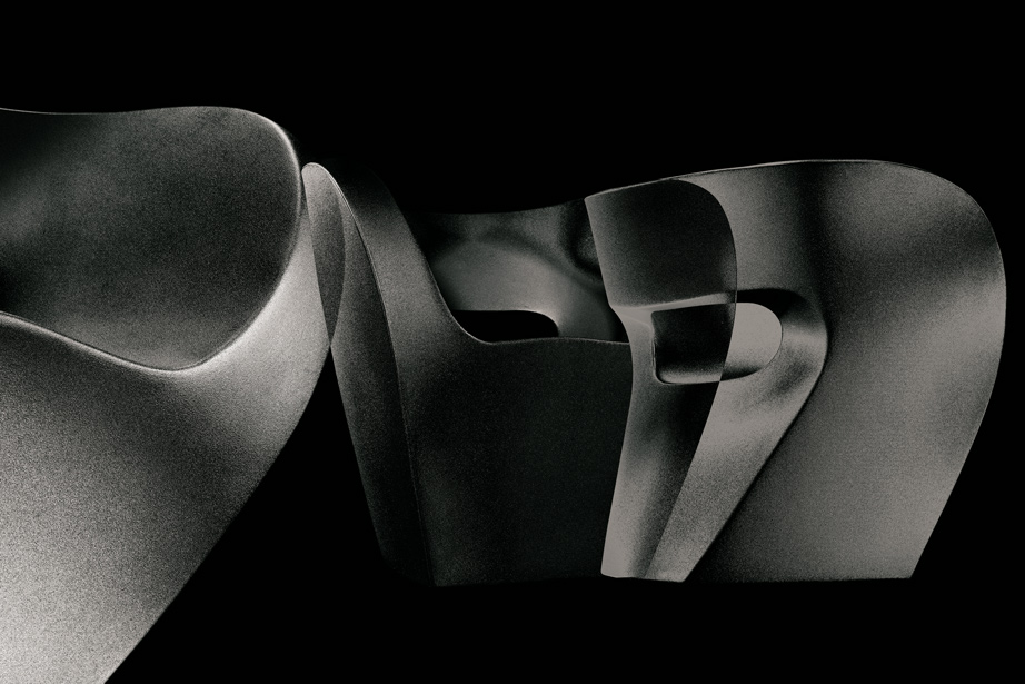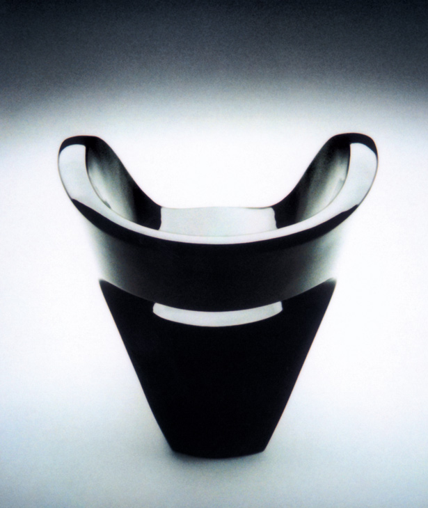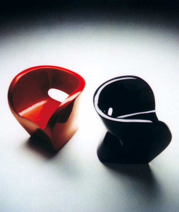 Linee curve in flusso continuo, figure-immagine disegnate in continuità, senza mai staccare la matita dal foglio. In origine un “donut”, che diventa idea per una scultura: schiacciata, rimodellata, un punto di vista ironico che supera l’approccio particolare del design industriale. Poi l’oggetto: sulla struttura interna, in vetro resina e fibra di vetro, un’imbottitura e poi un vestito cuciti su misura svelano la coincidenza tra il valore tecnico e quello espressivo del progetto Linee sensibili ma forti, mai interrotte, corrispondenza rigorosa tra superficie e forma, tra epidermide e corpo. Il tessuto invade lo spazio esaltando e potenziando la materia, senza sovrapporsi al flusso, senza interromperlo.
