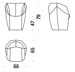 Blocchi smussati dal taglio di una lama immaginaria. L’ordine geometrico è rotto, travolto a favore di un movimento, di un margine che attraversa i perimetri. Le facce rendono evidente la nervatura; alcune cuciture, evidenti come imbastiture, la disegnano, altre scompaiono. L’utilizzo è libero, la superficie morbida. La forma esterna, dal punto di vista dei volumi, appare indipendente dalla struttura e dall’imbottitura interna. Divano, poltrona, poltroncina: un sistema componibile dove ogni elemento mantiene indipendente il carattere, per funzione e presenza scultorea.