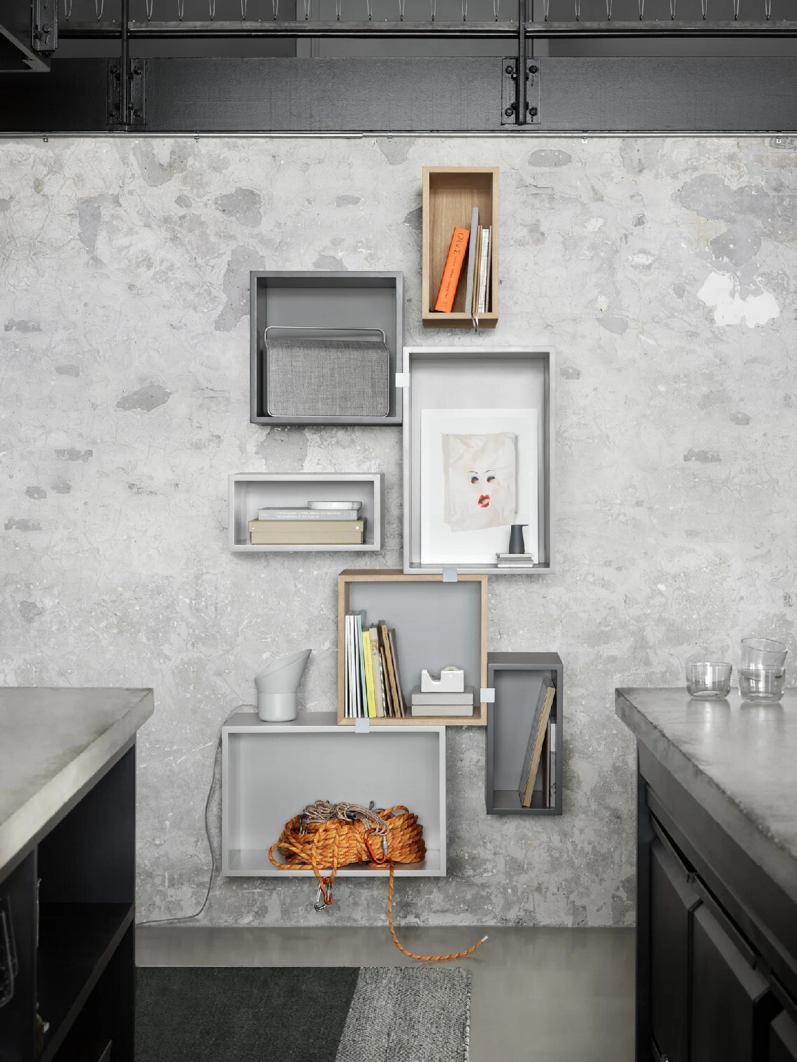 Being both versatile and functional, the Stacked Storage System can be arranged and rearranged for the exact aesthetic and functional needs of any space. Seen here is a selection of predesigned sideboard configurations that bring modern storage to any home, workplace or hospitality setting. All modules with backboard can be mounted directly onto the wall.