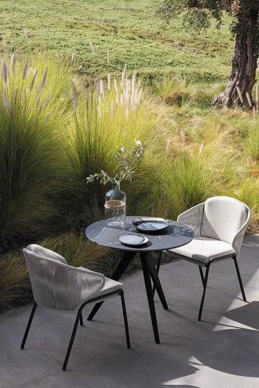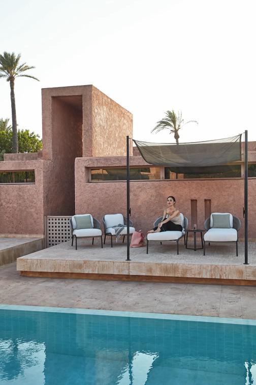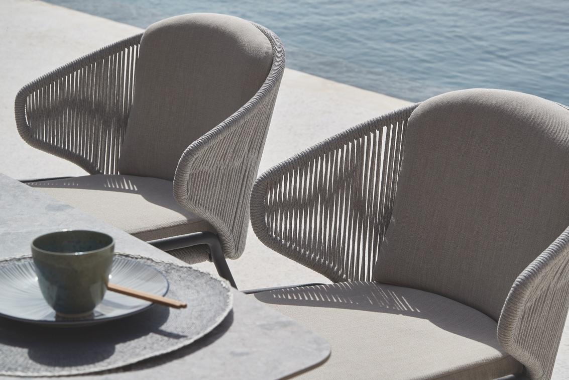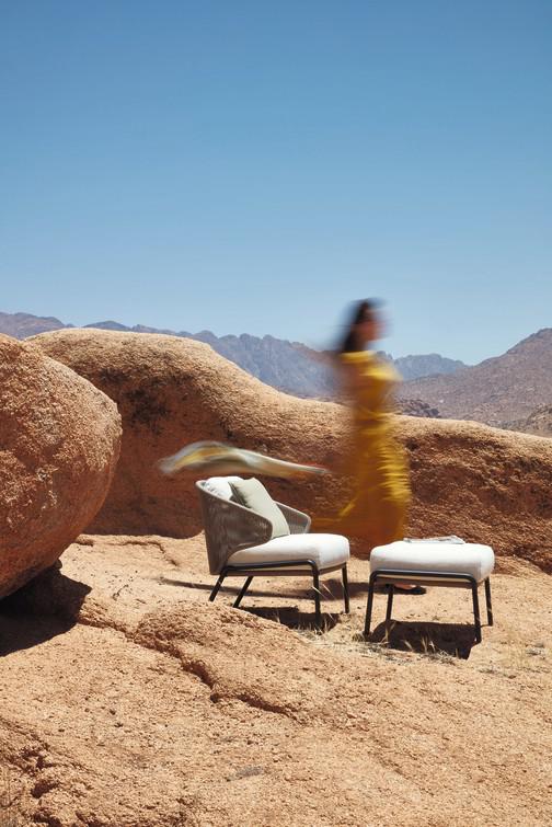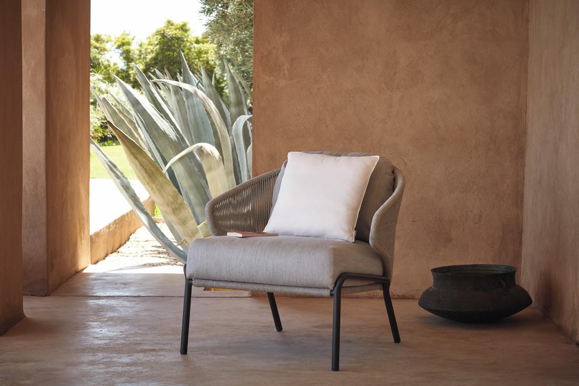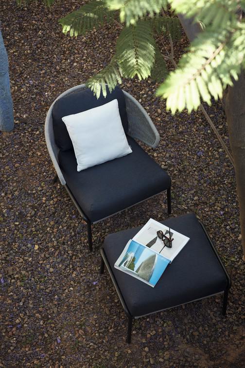 The unique, airy design of the Radius chair, footstool, lounge chair and sofa collection is perfect for exquisite moments of warmth and closeness. The wrap-around back and armrests, made entirely out of rope, blend seamlessly and give each piece a neomodern yet timeless look and feel. Keep it sober or opt for matching backrest cushions designed for optimal seating comfort for long get-togethers.