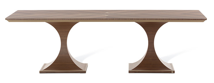 Tavolo in legno. Top in legno con intarsio e dettagli in metallo laccato color oro satinato.